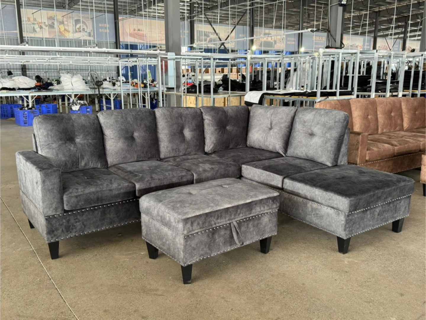 Selling a comfortable grey sectional sofa, complete with a matching ottoman! It features a stylish design with studded detailing and is perfect for a living room or family room. The cushions are plush and inviting, making it a great spot to relax after a long day