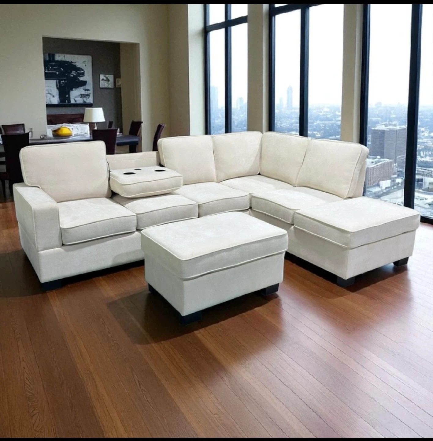 Selling a comfortable cream-coloured sectional sofa with an ottoman. It's in great shape and would be a lovely addition to any living room!