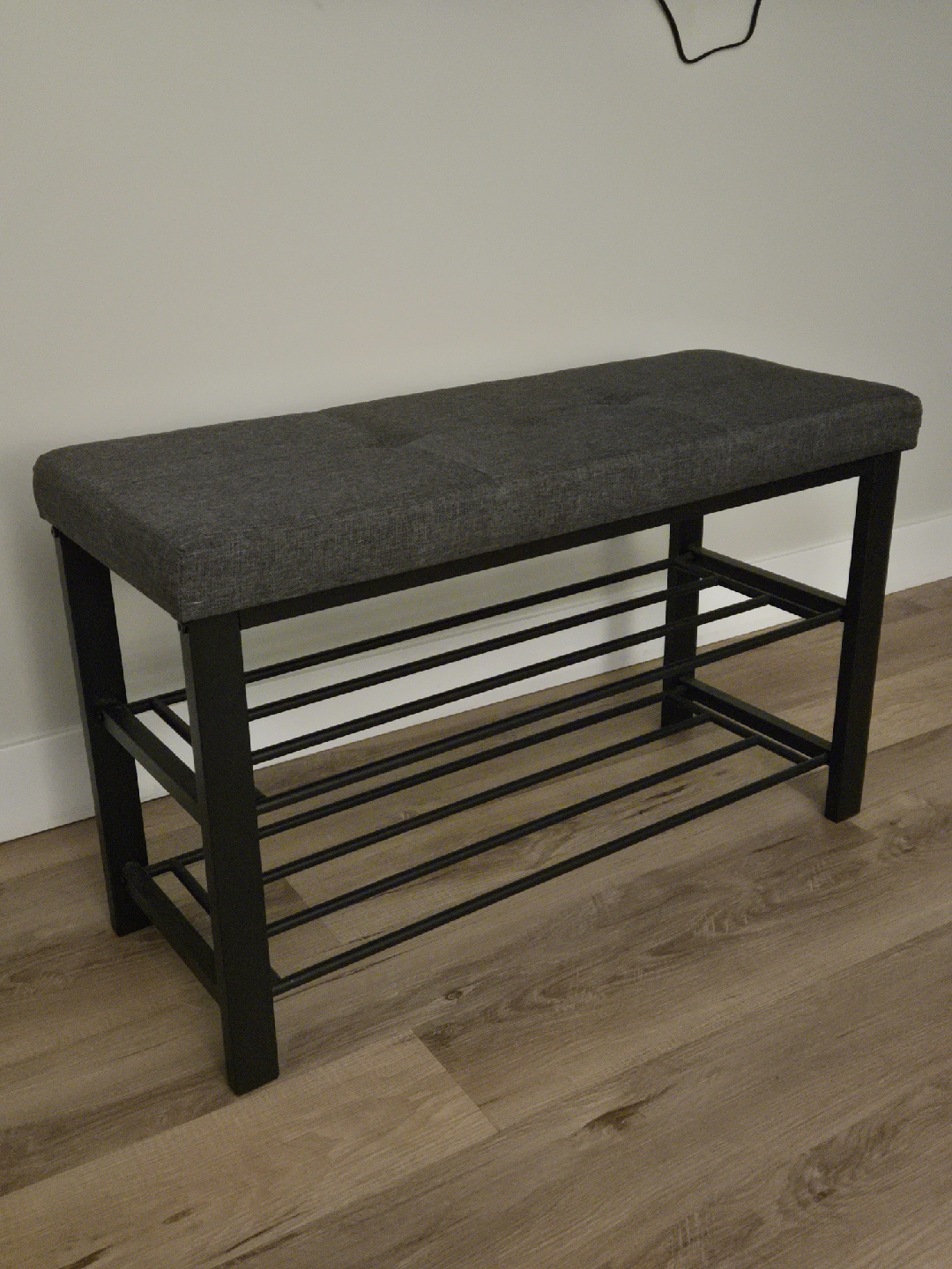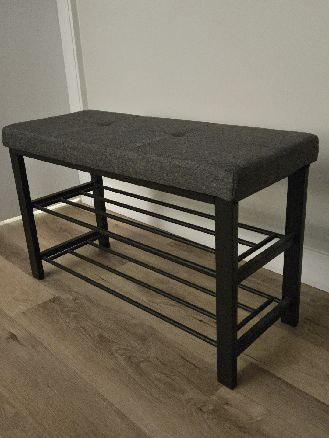 Looking to sell this handy entryway bench! It features a comfortable upholstered top in a neutral grey colour, perfect for sitting while you put on your shoes. The black metal frame includes built-in shoe storage shelves, helping to keep your entryway tidy and organized. It's in great condition and ready for a new home!