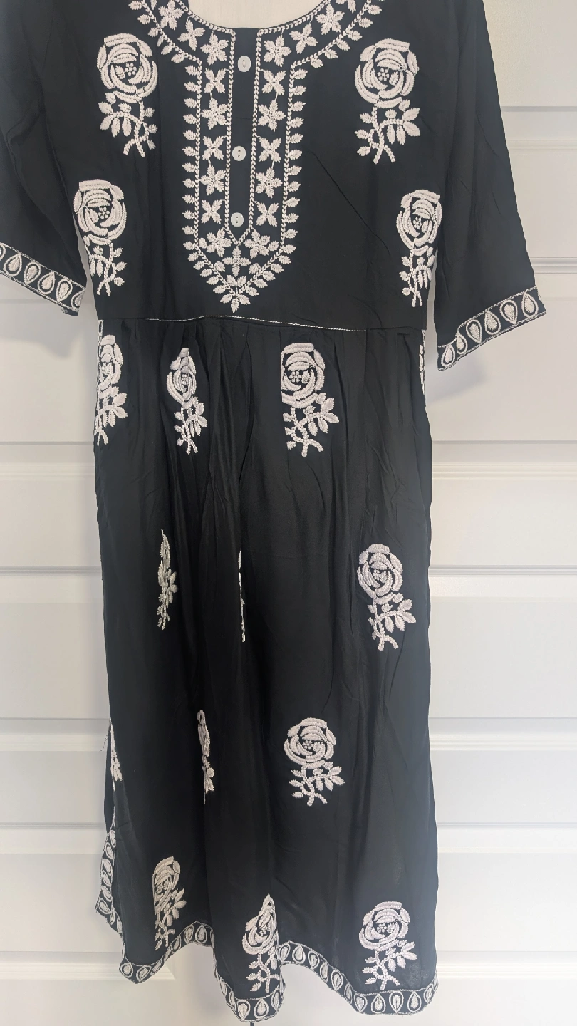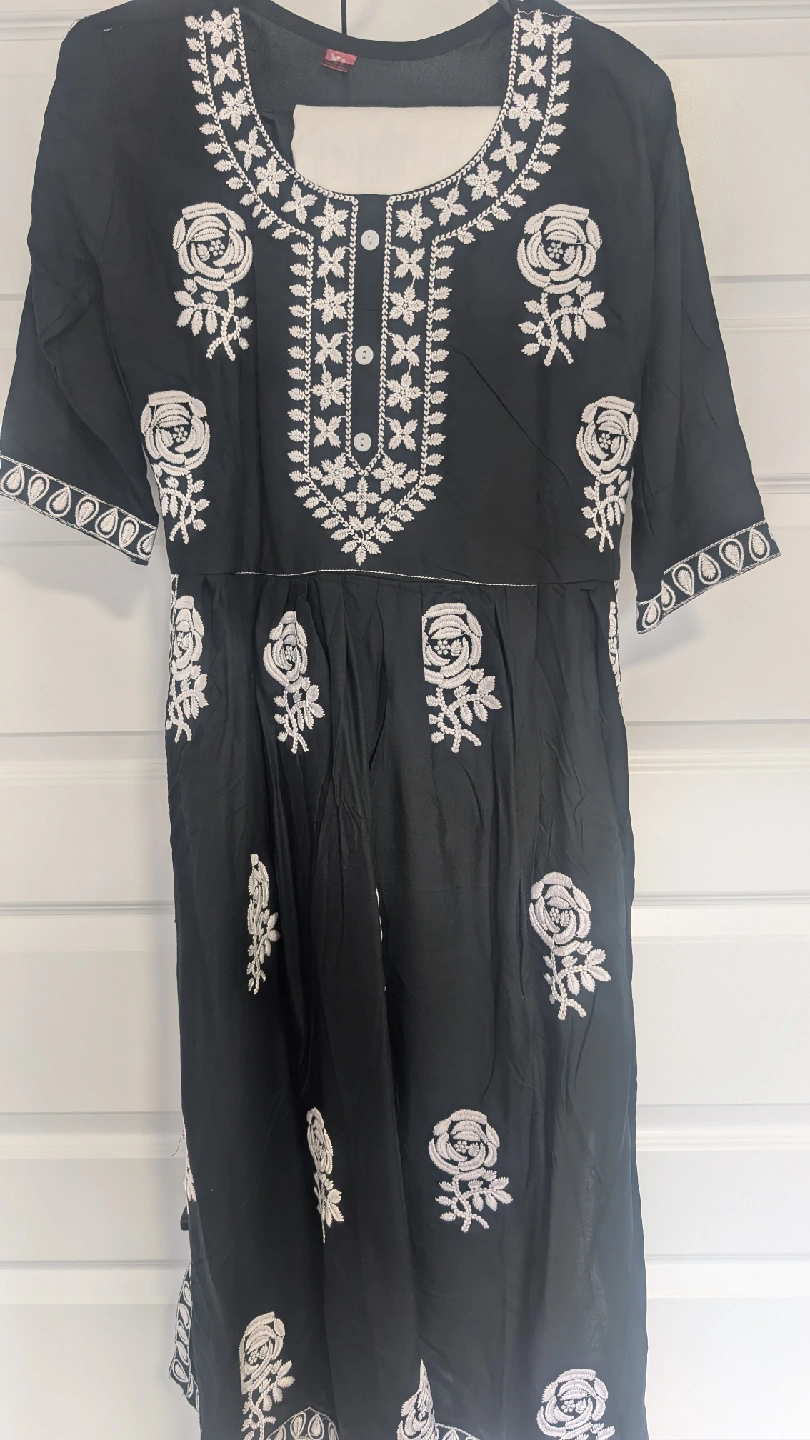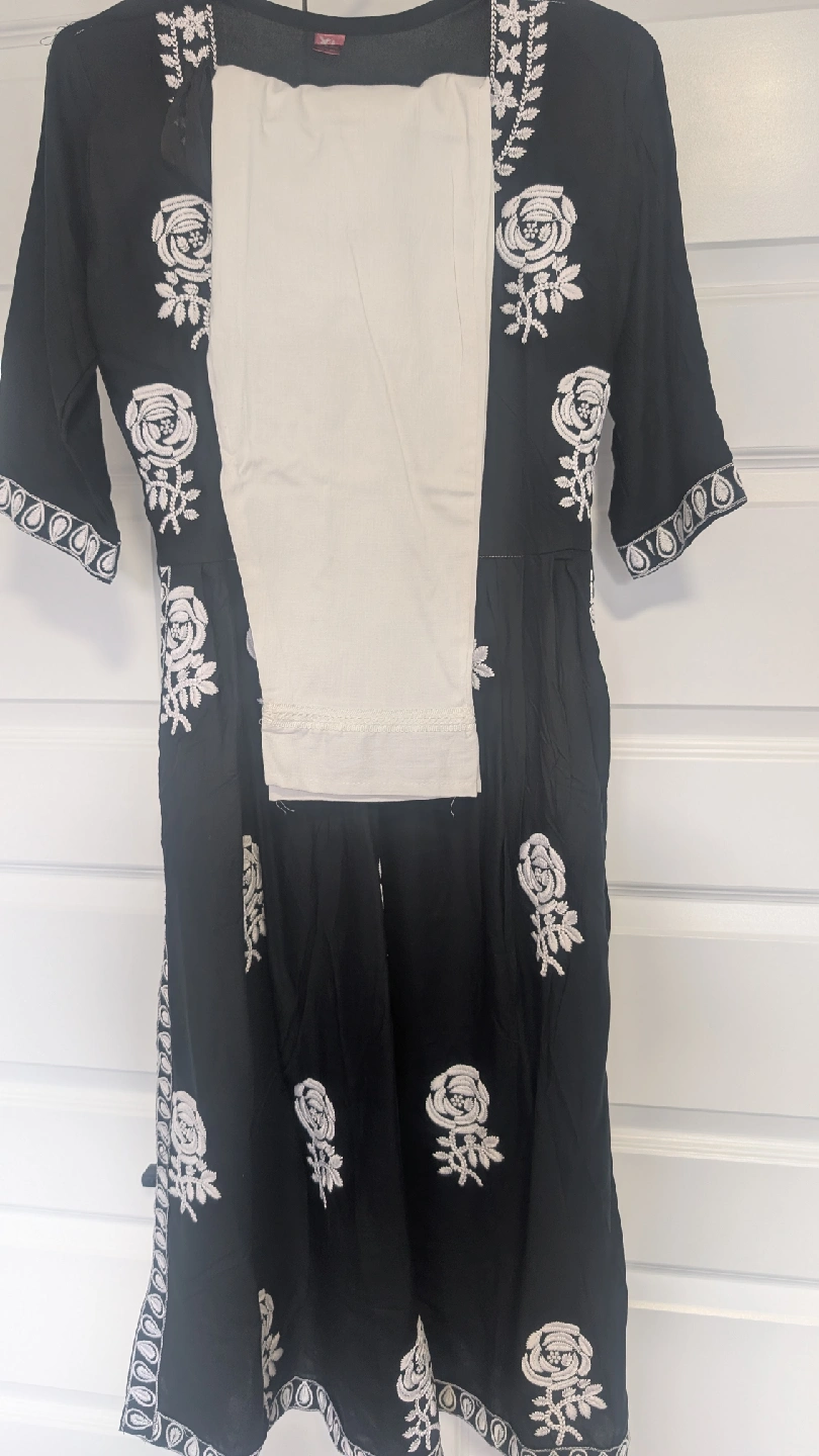 Selling a beautiful black kurti set with white embroidery. It looks great for casual wear or a special occasion. The set includes the kurti top and matching pants.