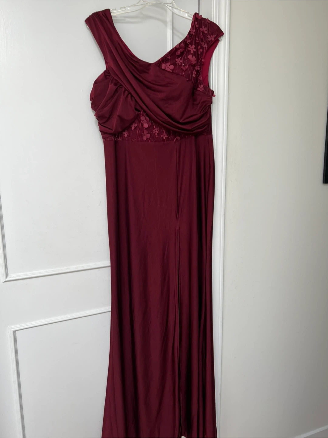 A lovely burgundy formal dress with floral detailing. It's in great condition and ready for its next special occasion