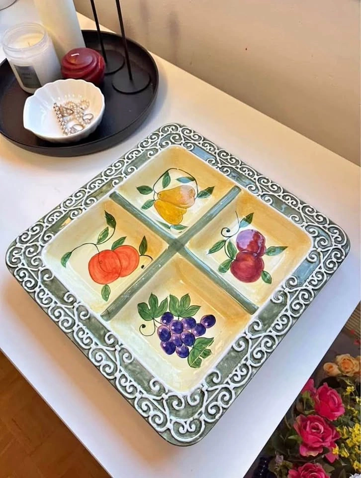 Beautiful hand-painted ceramic divided serving tray with fruit design. Perfect for snacks, nuts, or candy, but also gorgeous as a decorative piece for the kitchen or dining room.