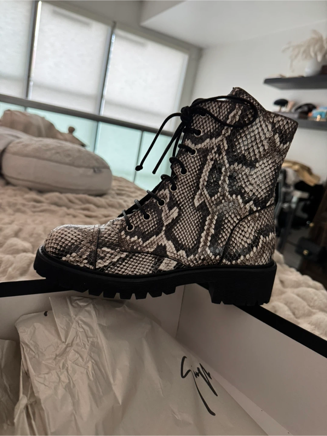 Selling a pair of Giuseppe Zanotti combat boots with a snakeskin print. They are a size 7.5 and come with the original box. These boots are super stylish and brand new! Dust bag and box included.