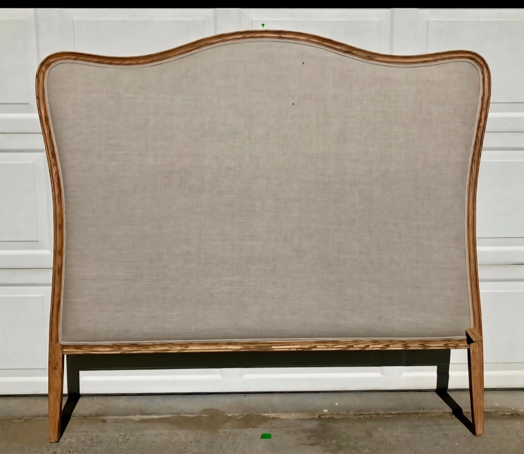 Selling a gently used headboard with a neutral-toned upholstered panel and a light wood frame. It's in great shape and would look lovely in any bedroom!
