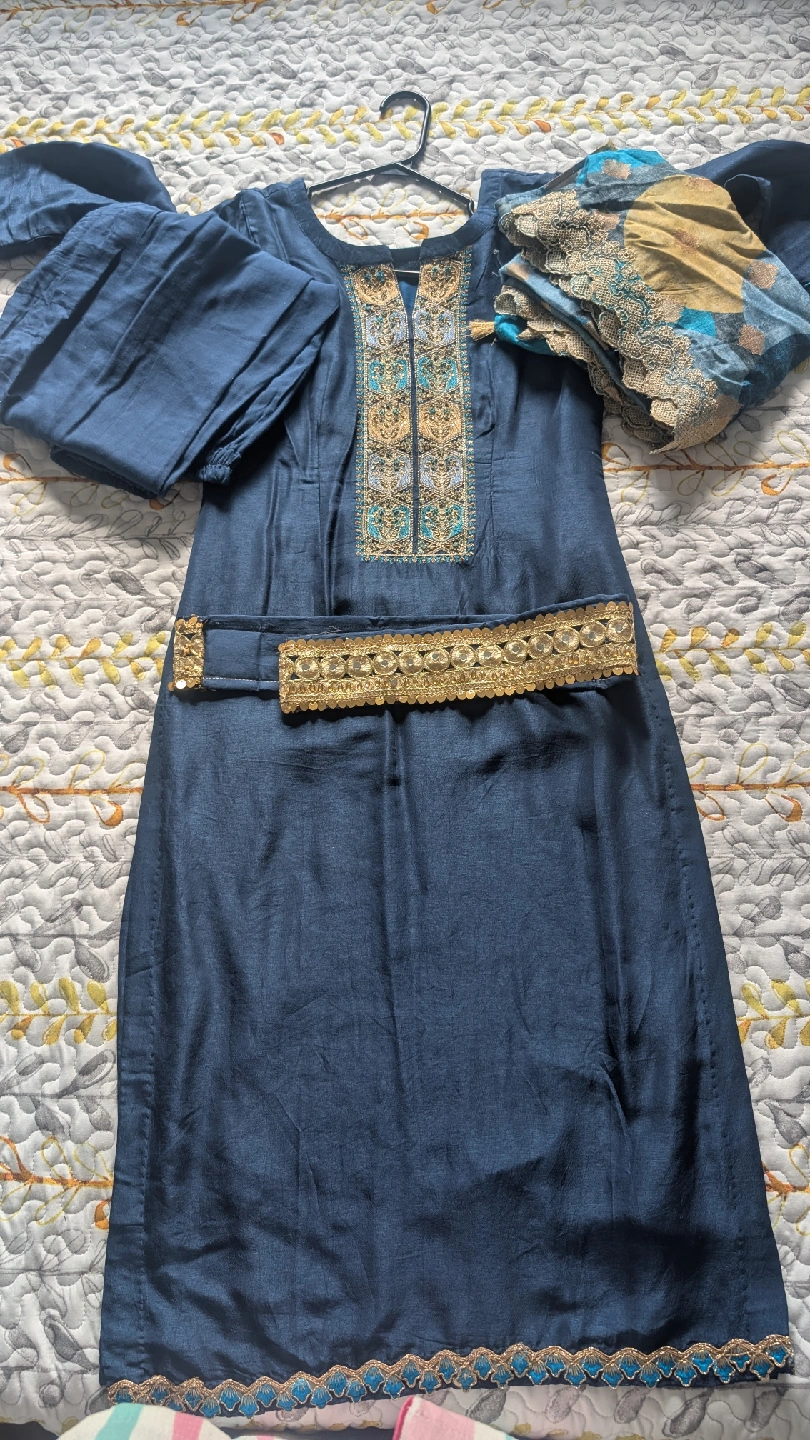 Selling a beautiful salwar kameez suit. It's a lovely blue colour with gold detailing. Includes the kameez (tunic), salwar (pants), and dupatta (scarf).