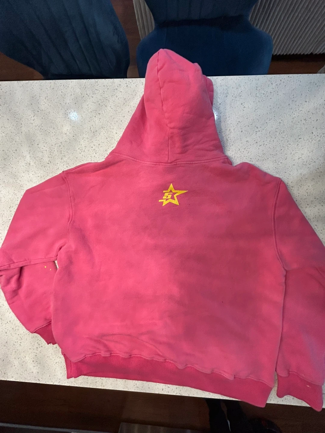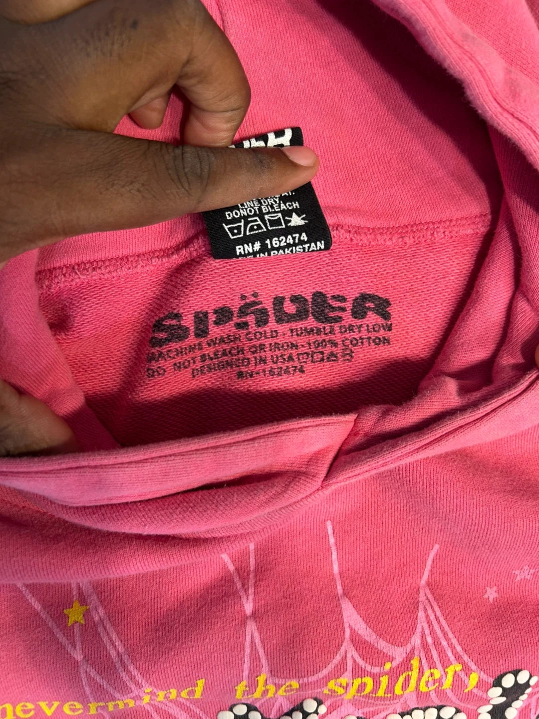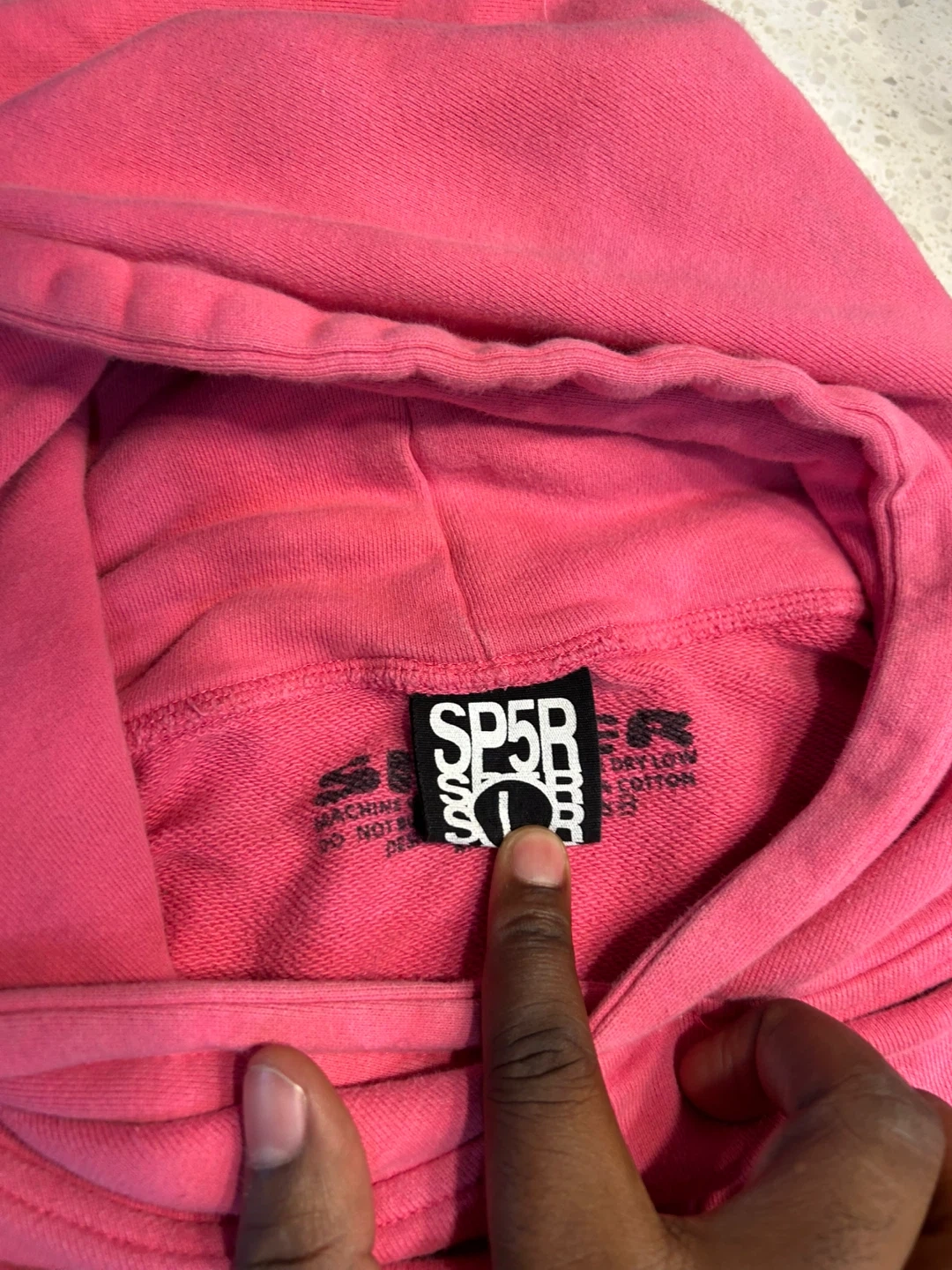 67Selling a pink SP5DER hoodie in size large. It features a spiderweb design on the front and the SP5DER logo on the back. The material is soft and comfortable, perfect for everyday wear!