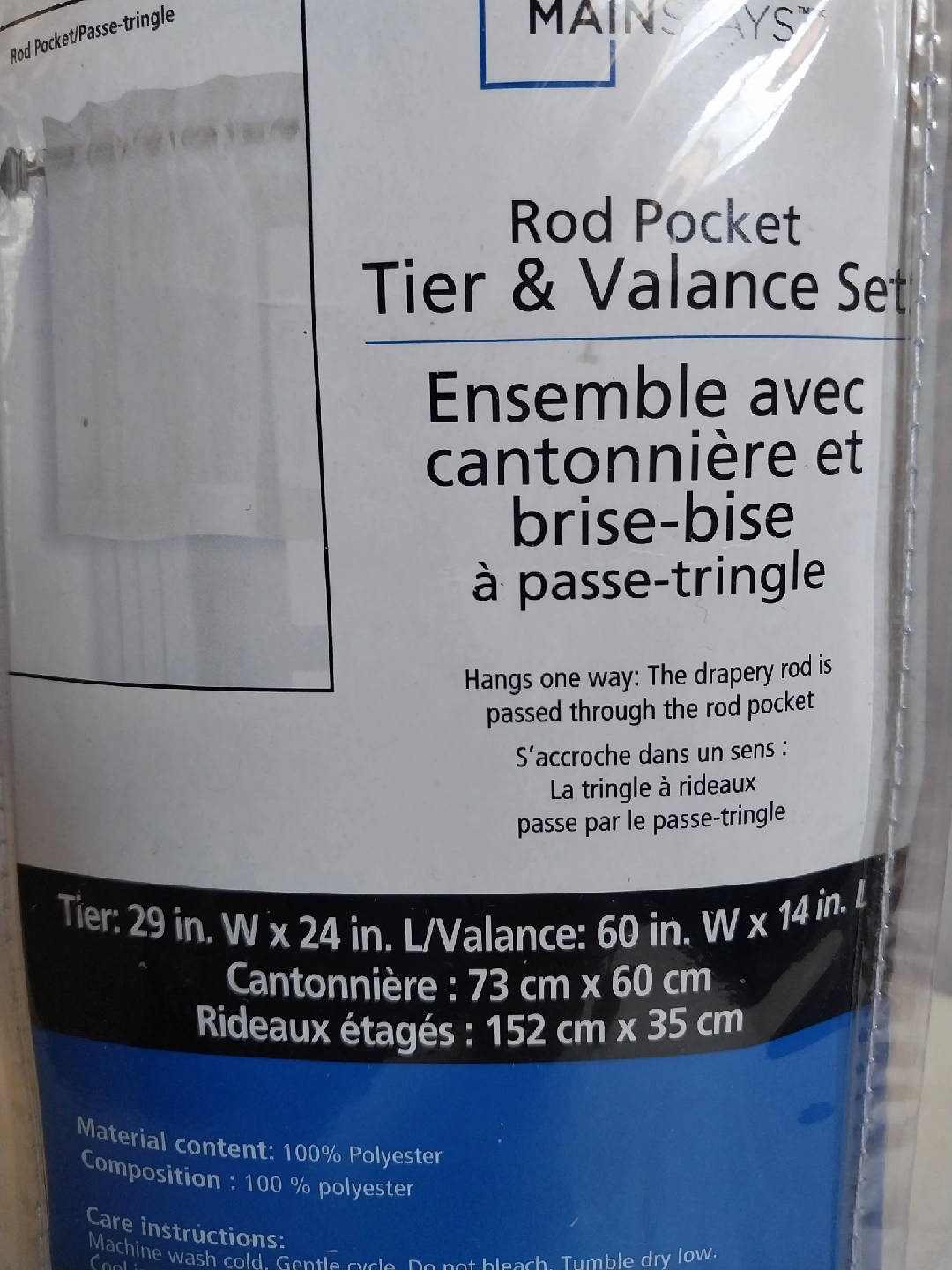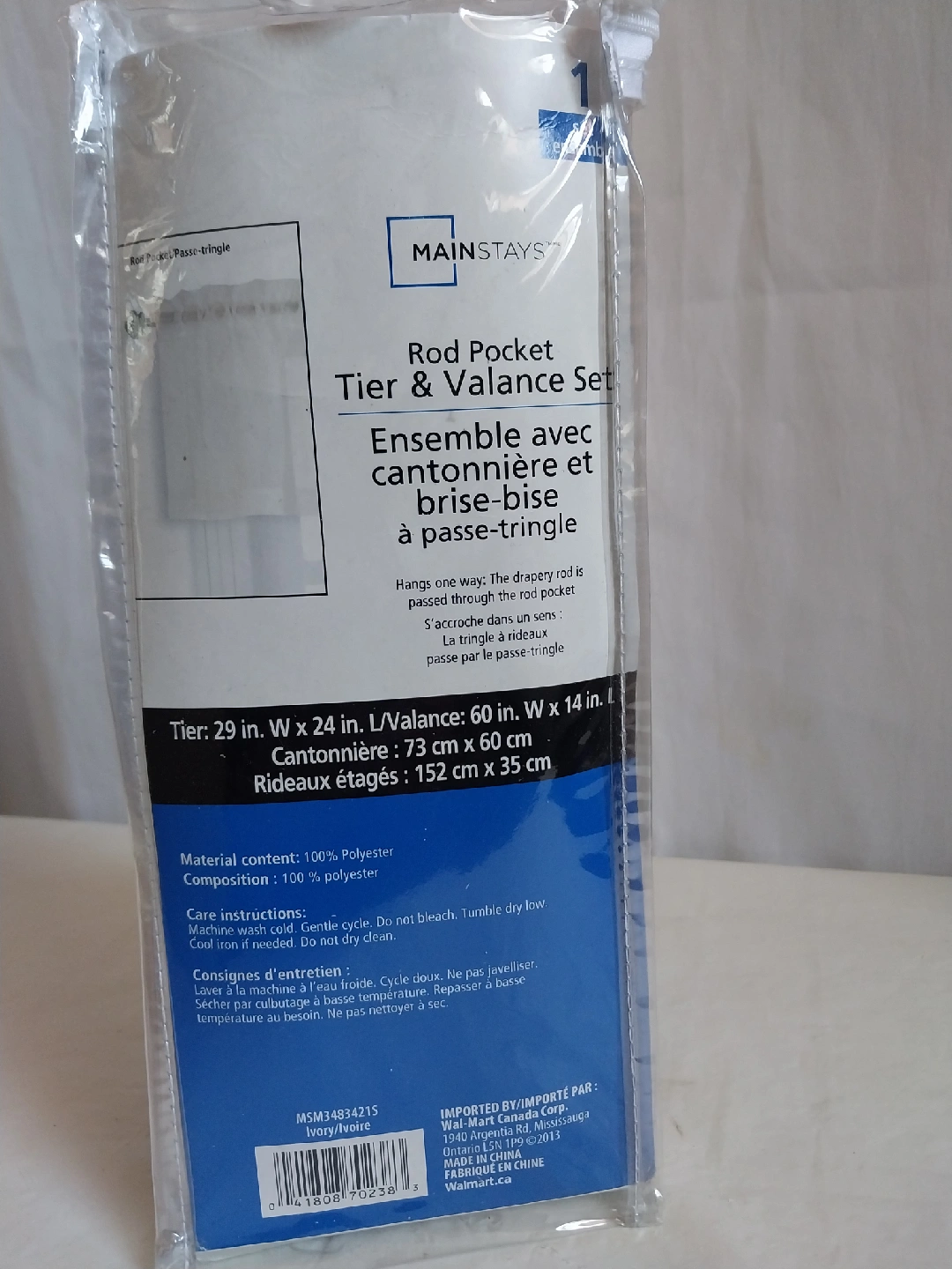 1000+*Cash and pick up ONLY at location shown on ad. *No trades or delivery. Selling a Mainstays Rod Pocket Tier & Valance Set in Ivory! The set includes a tier (29 in. W x 24 in. L / 73 cm x 60 cm) and a valance (60 in. W x 14 in. L / 152 cm x 35 cm). It's made of 100% polyester and is machine washable. Perfect for adding a touch of style to any room.