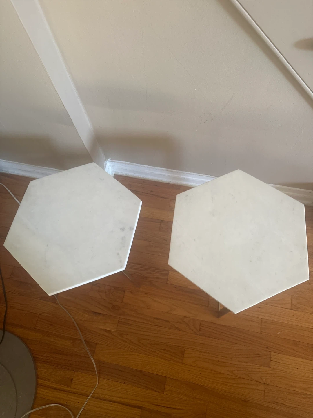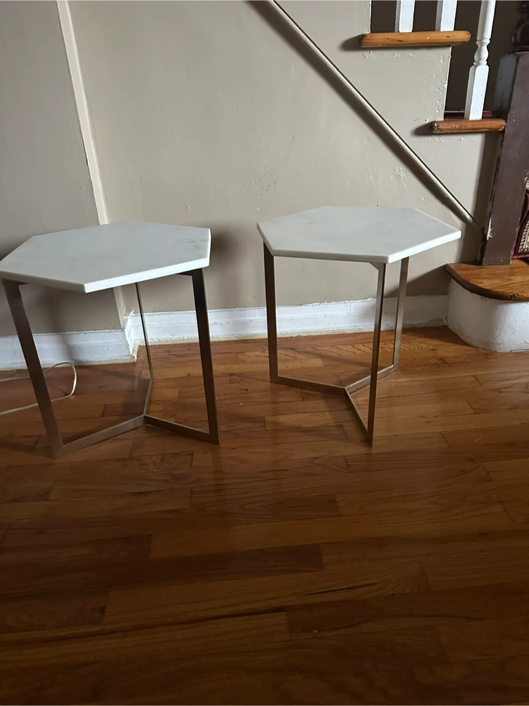 Selling a set of two William Sonoma hexagon-shaped side tables! They feature a beautiful marble top and a sleek gold frame. Perfect for adding a touch of modern elegance to any room