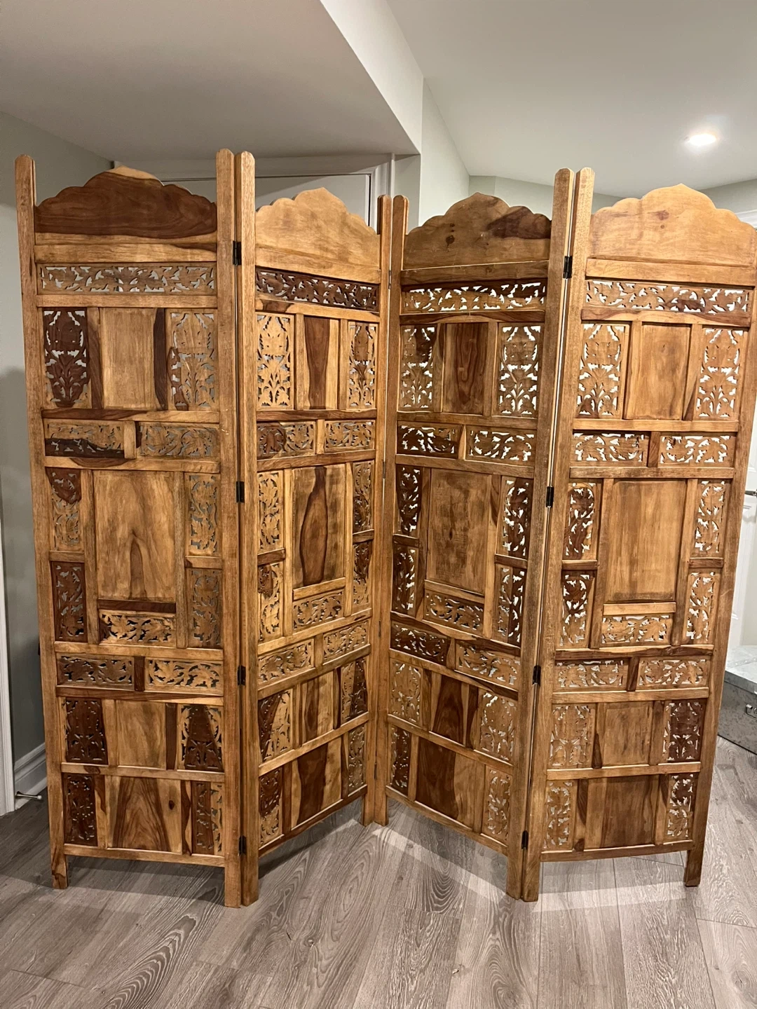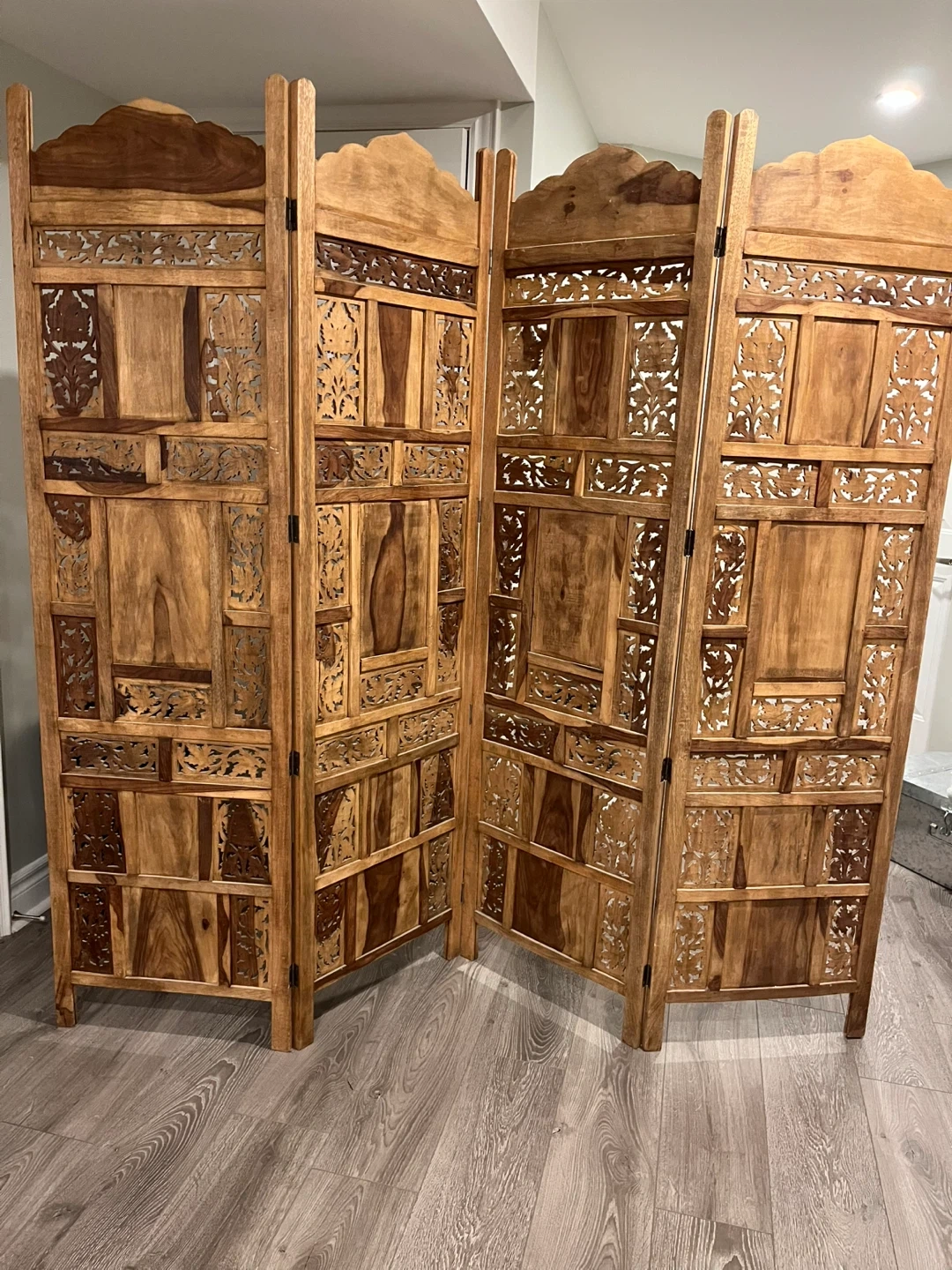 Selling a beautiful wooden room divider screen. It’s teak wood and beautifully ornate , very heavy It features a lovely carved design and would be a great addition to any room. It's in great condition and ready for a new home!