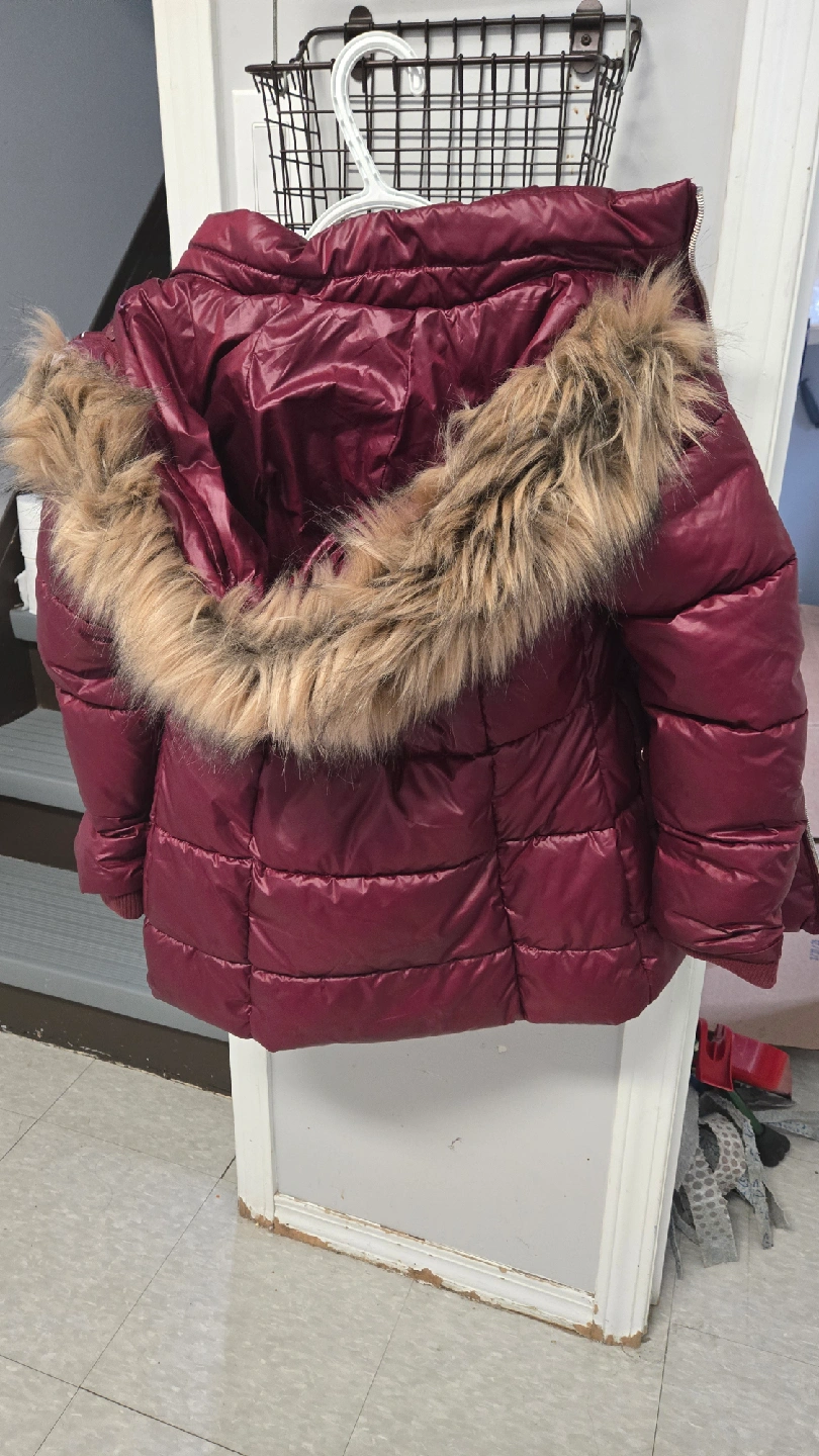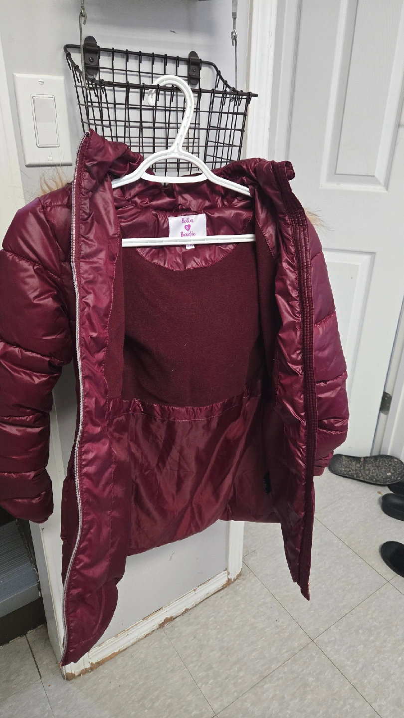 Here's a Bella Benetton puffer jacket in a lovely burgundy colour! It has a faux fur trim on the hood, perfect for keeping cozy on chilly days. It's in great condition and ready for a new home
