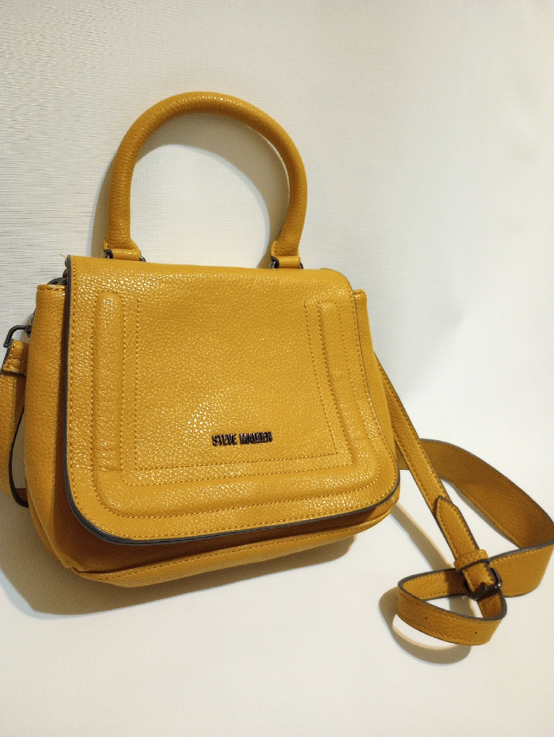 Mustard yellow shoulder/hand bag in a textured leather material. Like new condition, barely used. Features patterned lining and several pockets.