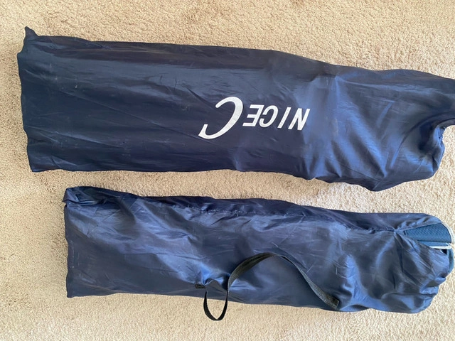 Enjoy comfortable outdoor relaxation with this NICE C camping cot, perfect for camping or lounging in the backyard. This cot features a sturdy frame and durable fabric, providing excellent support and comfort. It's in good condition and comes with a carry bag for easy transport. Specifications: * Brand: NICE C * Type: Camping Cot * Condition: Good * Includes: Carry bag Comparable camping cots are sold on Kijiji for around $80-$150 If the ad is still up, it's still available and ready for a new home! Price is for each.