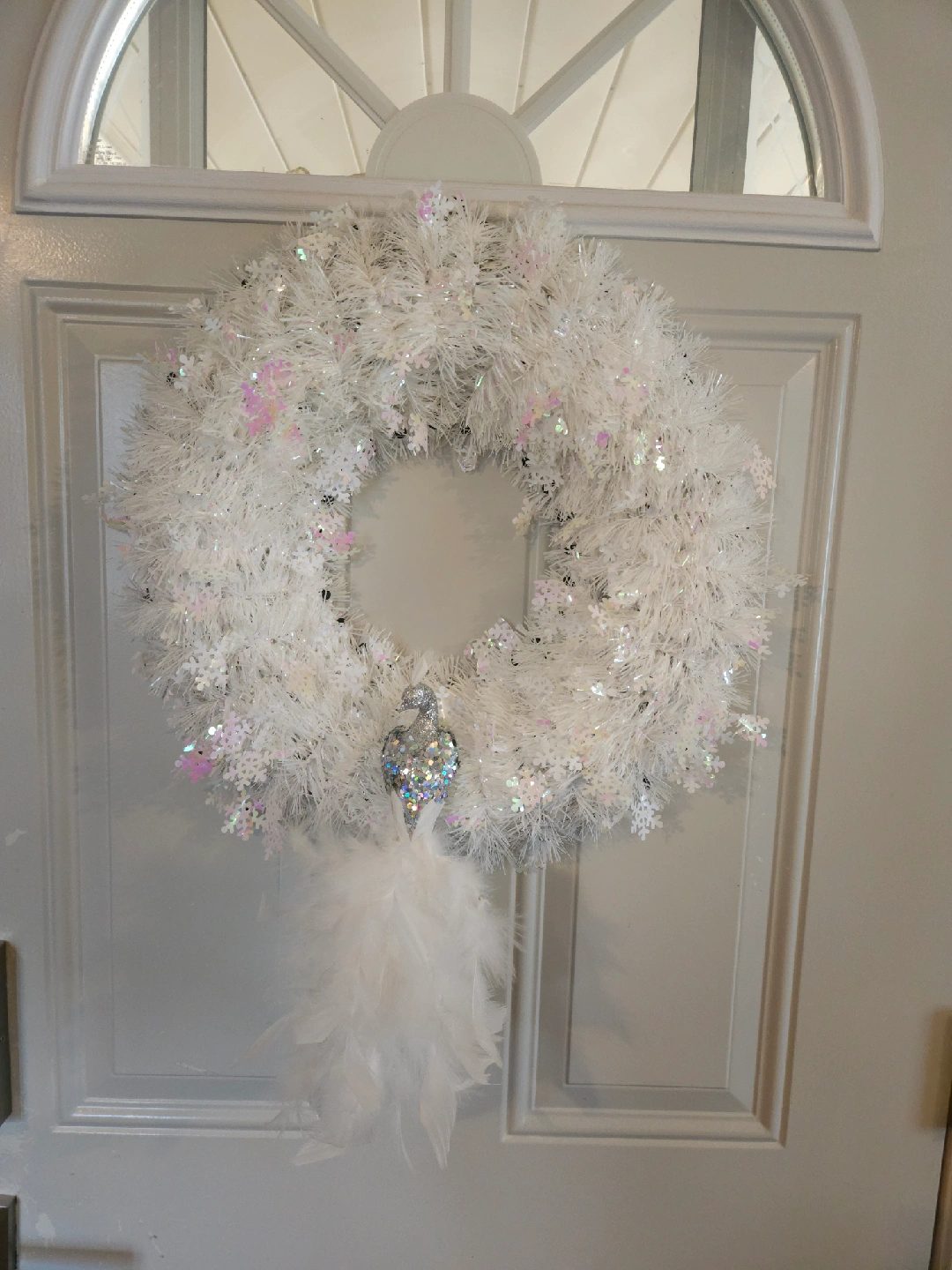 Selling a white Christmas wreath, perfect for adding a touch of winter wonderland to your home! It features a sparkling peacock ornament. It's in great condition.