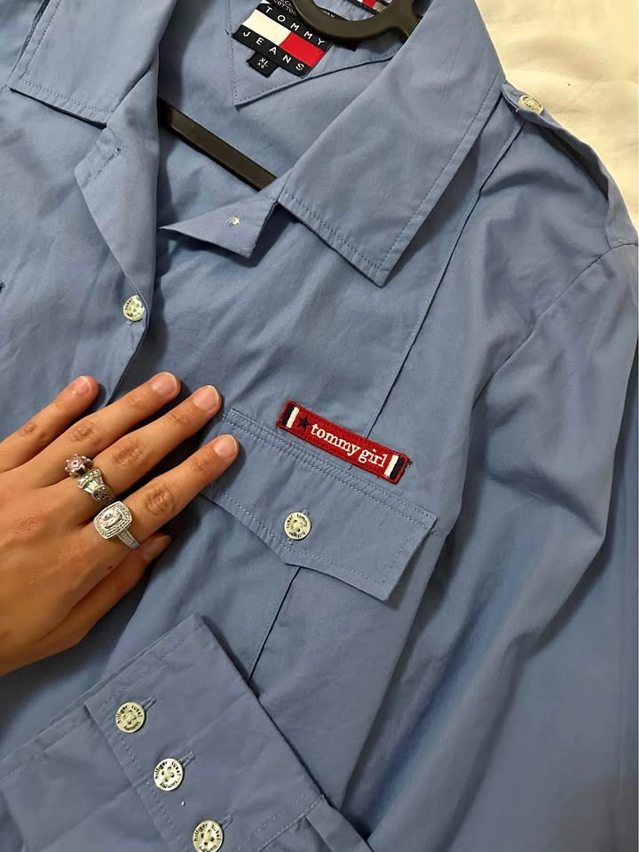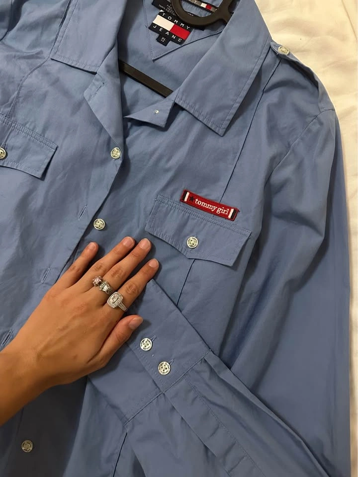 100% cotton. It’s fitted. “Tommy Girl” embroidered above chest pocket. Tagged as size XL but measurements fit a size medium best. Check measurements below to ensure your perfect fit :)