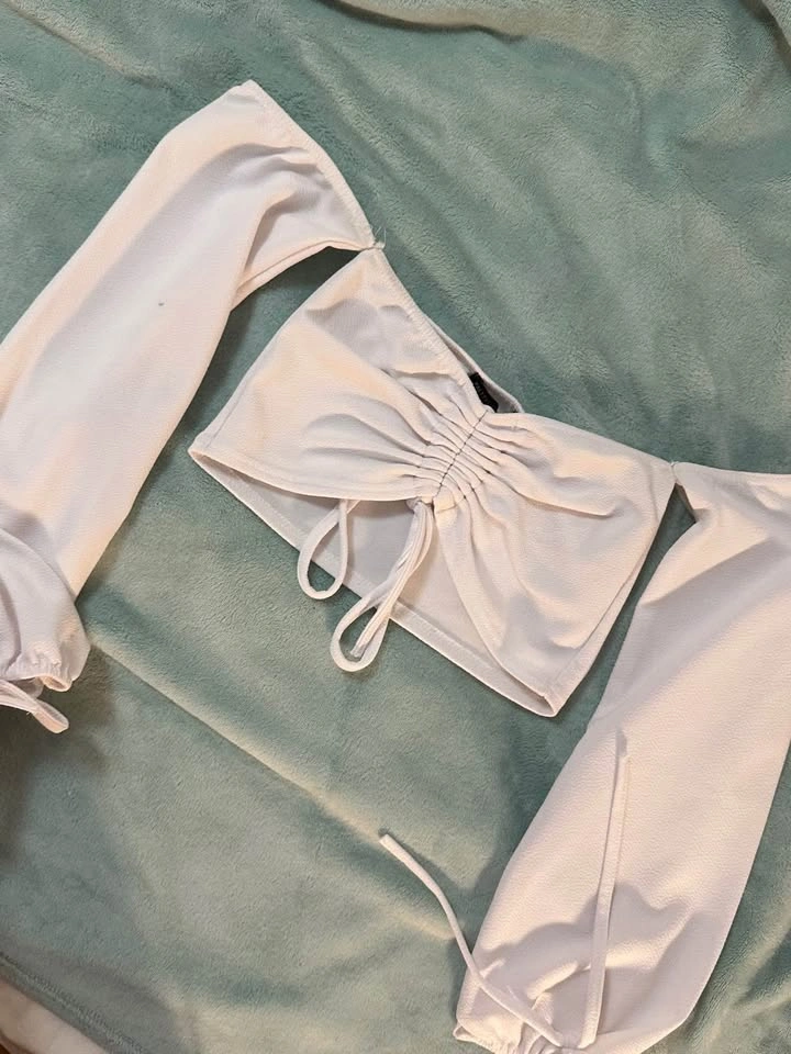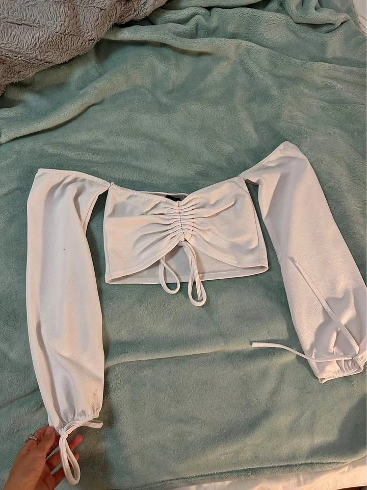 19Size small & xs. Off shoulder. Super cute tie details and scrunched middle. Brand is pretty little thing