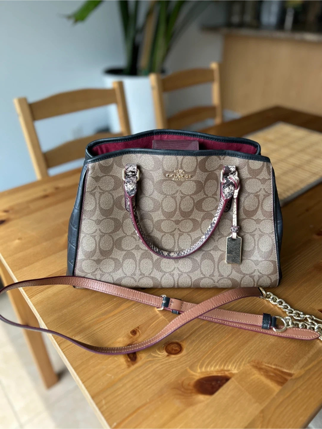 96Selling a Coach handbag with the signature jacquard pattern and leather trim. It comes with a shoulder strap. The interior is a lovely red colour. The hardware is gold.