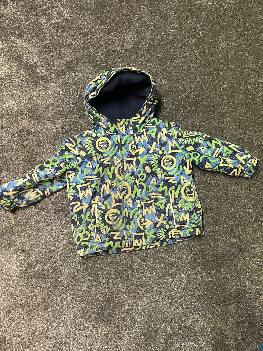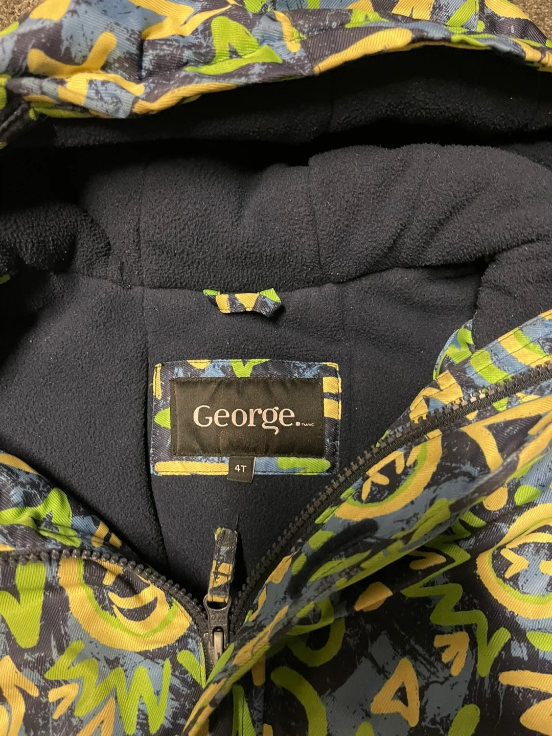 18Here's a fun and colourful jacket for your little one! It's a George brand jacket, size 4T, perfect for keeping them warm and stylish. The jacket features a unique, eye-catching pattern in shades of blue, green, and yellow. Great for everyday wear!
