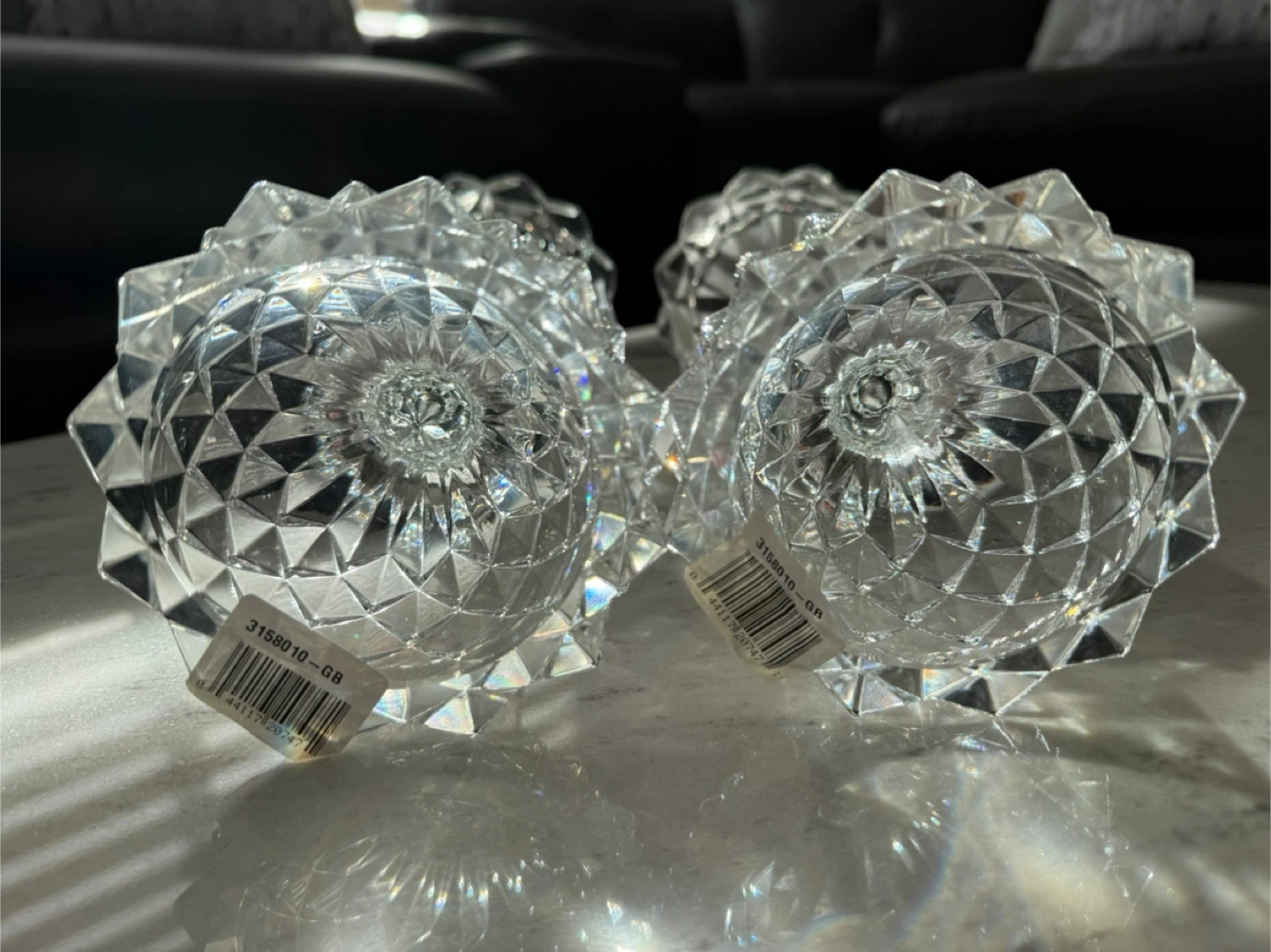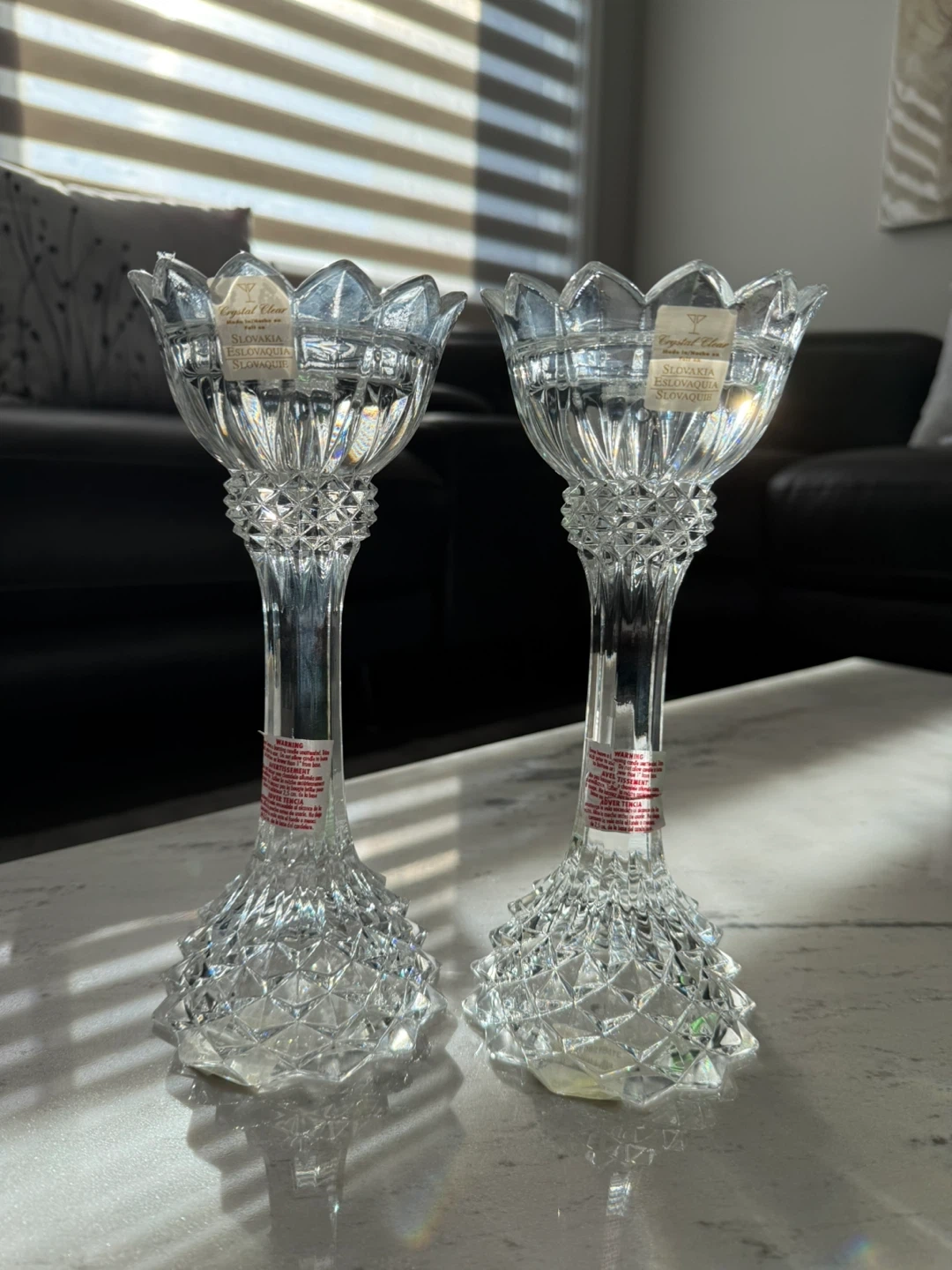 Selling a set of 2 Manhattan Candle Lights "Palace" candlesticks. These are made of 24% lead crystal and stand 10" tall. They are in perfect condition and would make a lovely gift or addition to any home.