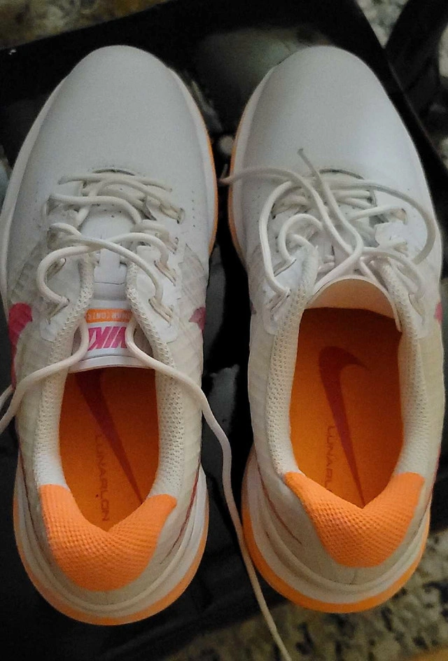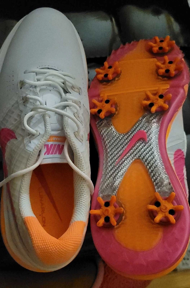 Elevate your golf game with these women's Nike Lunar Control golf shoes in a vibrant pink and orange colorway. Designed for comfort and performance, these sneakers feature Lunarlon cushioning, breathable polyester upper, and lightweight construction. The tie closure ensures a secure fit while the plastic cleats provide excellent traction on the course. Perfect for any season, these Nike Lunar Control shoes are ideal for avid female golfers looking for a stylish and functional addition to their sports wardrobe. The sneaker-style design with sporty features such as spikes and cushioning make these shoes a great choice for an active day out on the golf course. Feel free to message if you have any questions!