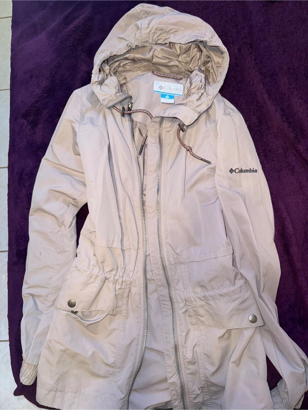 802Selling a Columbia hooded jacket in a lovely beige colour. It features a zip-up front, pockets, and a hood, perfect for those cooler days. Great for layering or wearing on its own!