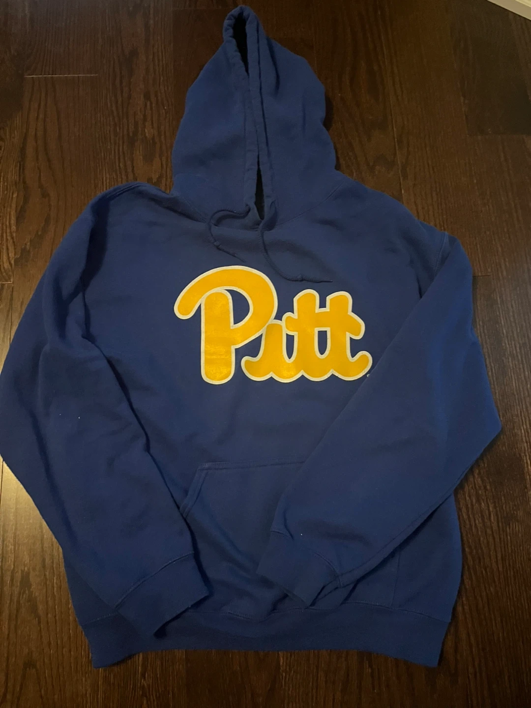Selling a blue and gold Pitt hoodie. It's in great condition and perfect for showing your school spirit! The colour is a vibrant blue with the classic 'Pitt' logo in gold. It's super comfy and great for everyday wear