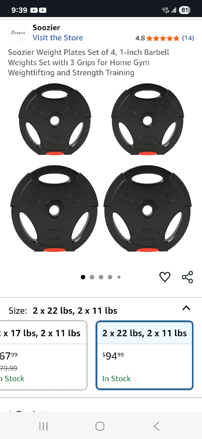 Selling a Soozier Weight Plates Set of 4, perfect for your home gym! This set includes: - 2 x 22 lbs plates - 2 x 11 lbs plates They're designed as 1-inch barbell weights with 3 grips for easy handling during weightlifting and strength training