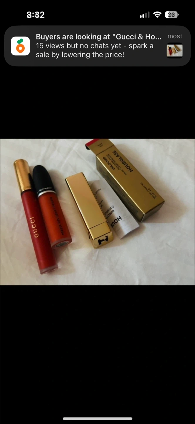 Selling a few lip products from Gucci and Hourglass. The Hourglass product is the Unlocked Satin Crème Lipstick. The Gucci product is a Rouge à Lèvres Liquid Lip Elixir