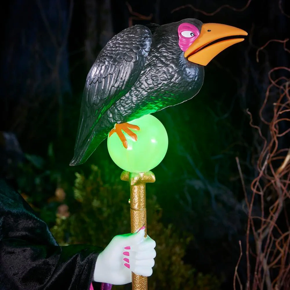 Speaks 5 classic Maleficent phrases and includes crow sounds