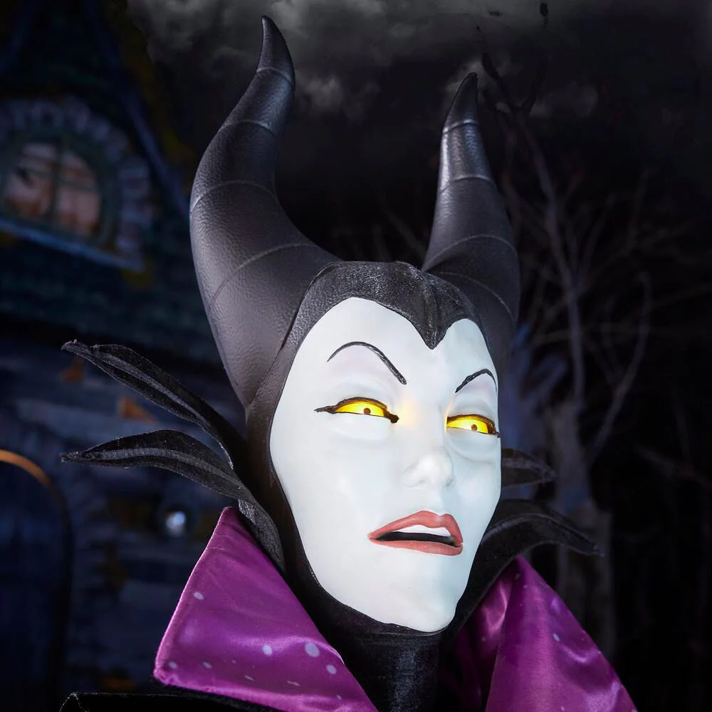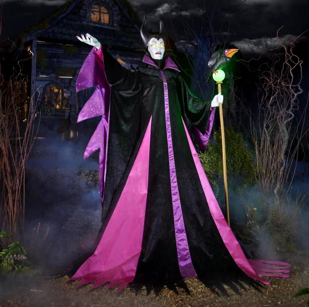 The Mistress of All Evil has arrived at The Home Depot. 6.5 ft. Animated LED Maleficent has orange light up LED eyes and a light up staff that glows green with Dark Magic. She has motion sensor activation and speaks several classic phrases for when unsuspecting visitors get too close. With a moving mouth, head, eyes, staff and crows mouth, this villain is sure to turn the head of any passerby. As elegant as she is evil, Maleficent is the perfect addition for any indoor Halloween or Disney inspired display.