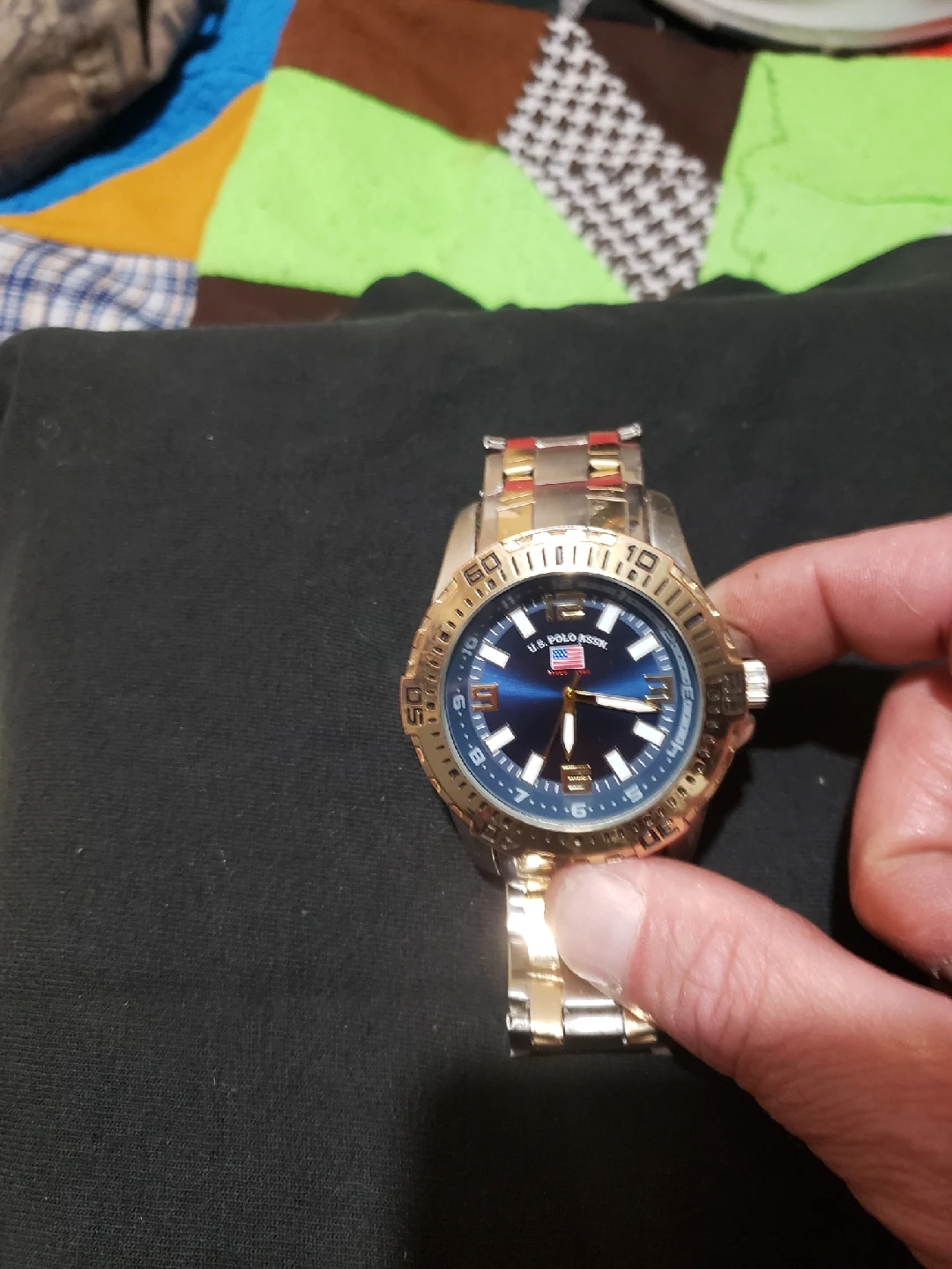 Selling a U.S. Polo Assn. watch with a silver and gold band. It has a blue face and is in good condition. A stylish accessory to add to your collection!