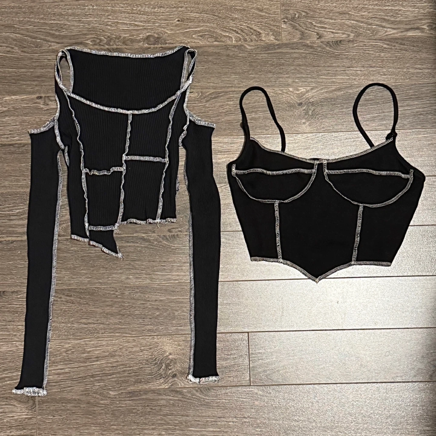 Selling a cute black long sleeve crop with matching tank top crop set. The set features a unique design with contrast stitching. Perfect for a night out or casual wear!