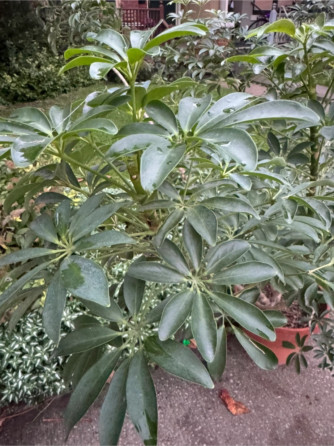The plant in the image is a Schefflera, commonly known as an umbrella plant or umbrella tree.