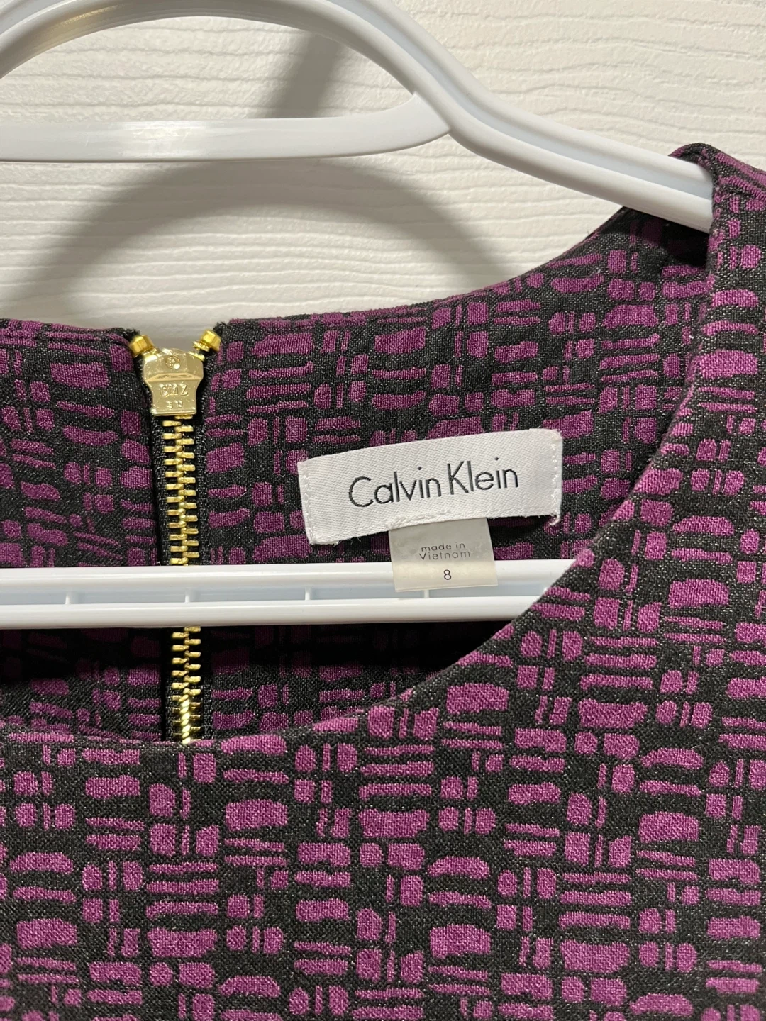 10Selling a Calvin Klein dress in size 8! The dress features a stylish pattern in shades of purple and black. Only worn twice. It's in great condition and ready for a new home.
