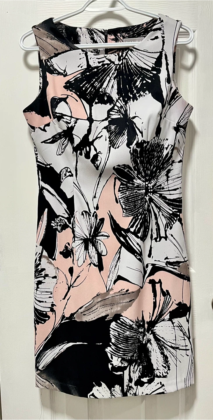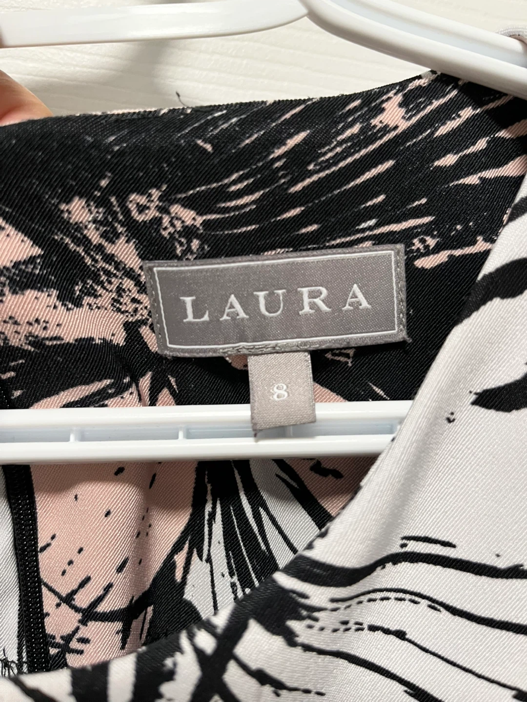 10Selling a Laura dress in size 8. It features a beautiful floral pattern in black, white, and blush tones. Perfect for a special occasion or a day out!
