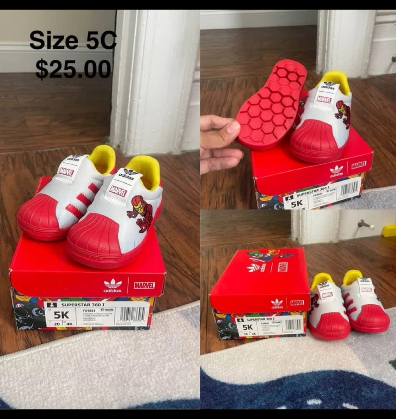 Used adidas sneakers, like new condition Selling a pair of Adidas Superstar 360 I shoes featuring Marvel's Iron Man! These adorable shoes are a size 5C and come with the original box. The shoes have a red and white color scheme with yellow lining and Marvel details. The box indicates the model number is FX4883.