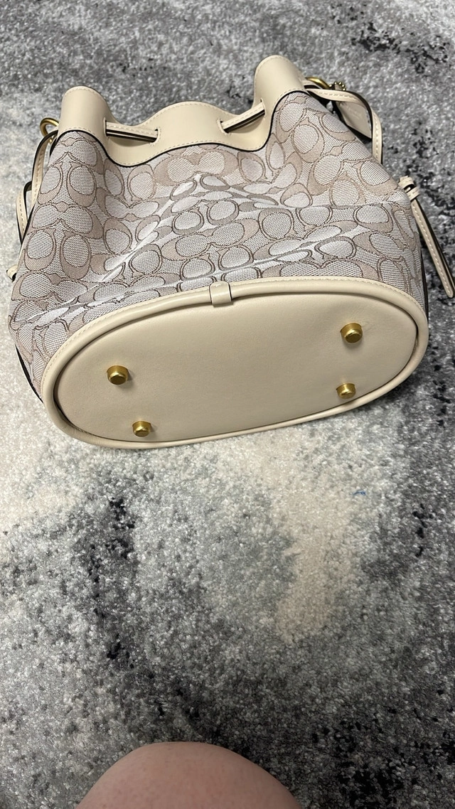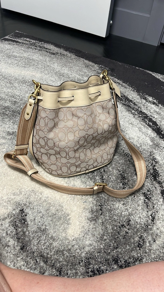 Brand new Coach jacquard and smooth leather bucket bag with a beautiful signature pattern and a versatile design. * Jacquard fabric with smooth leather trim * Adjustable crossbody shoulder strap * Drawstring closure * Interior features pocket. Let me know if you're interested!