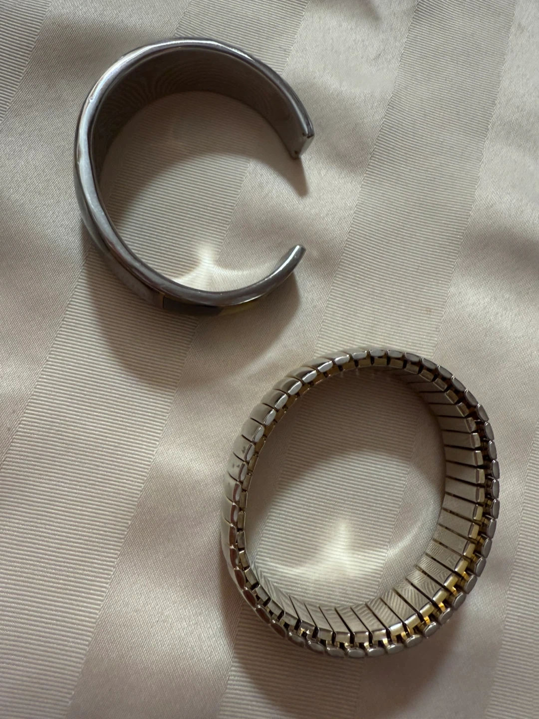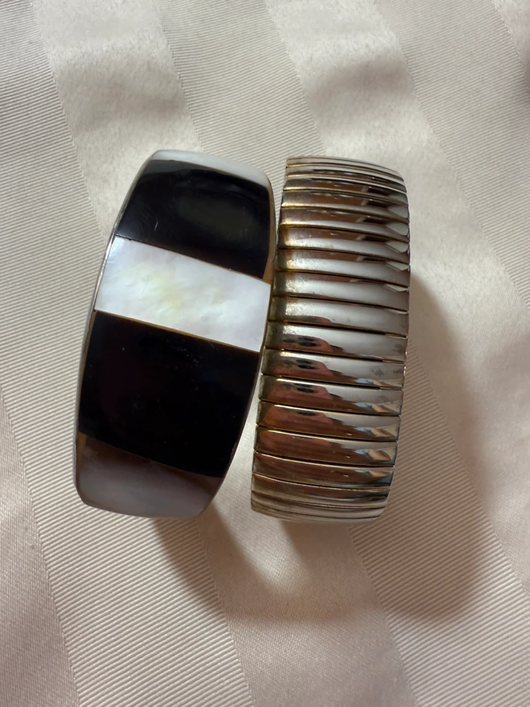 Selling these two bracelets together! One is a black and white cuff style, and the other is a silver-toned stretch bracelet.