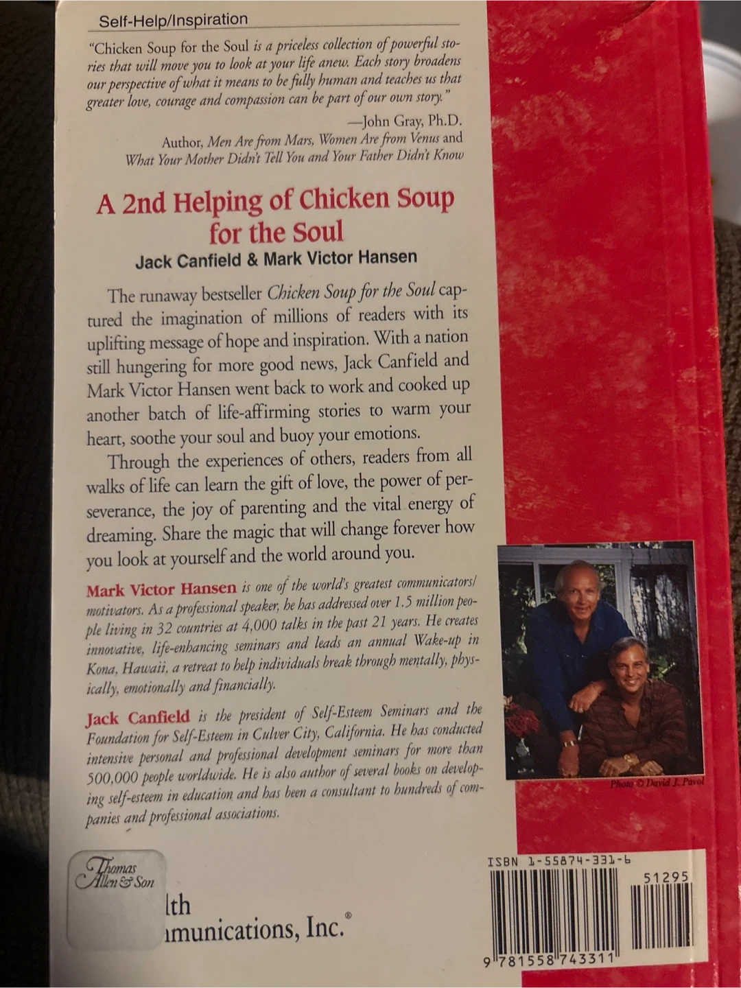 60Selling a copy of 'A 2nd Helping of Chicken Soup for the Soul' by Jack Canfield and Mark Victor Hansen! This book contains more than 101 stories to open the heart and rekindle the spirit. Selling for $8 obo.