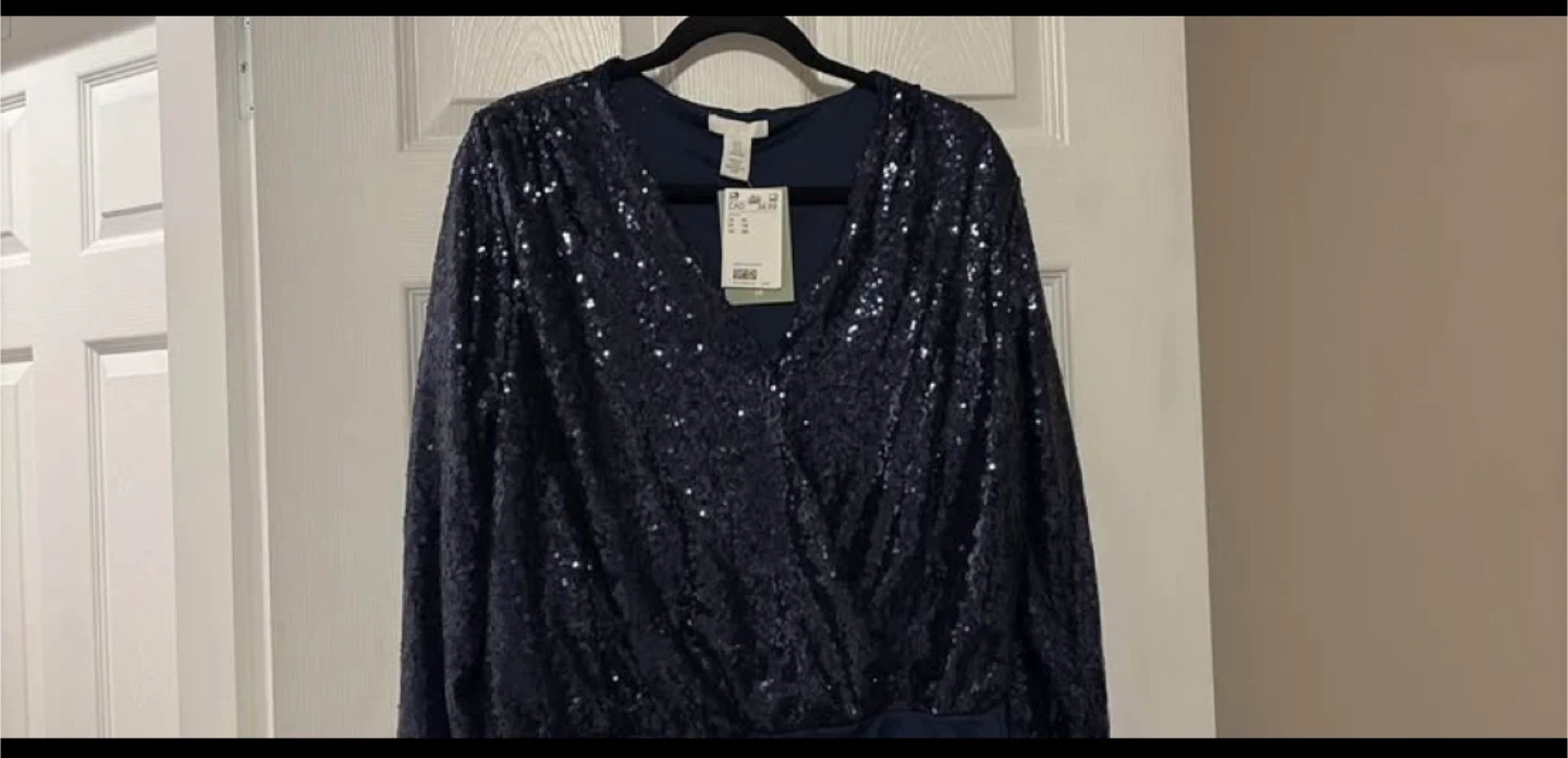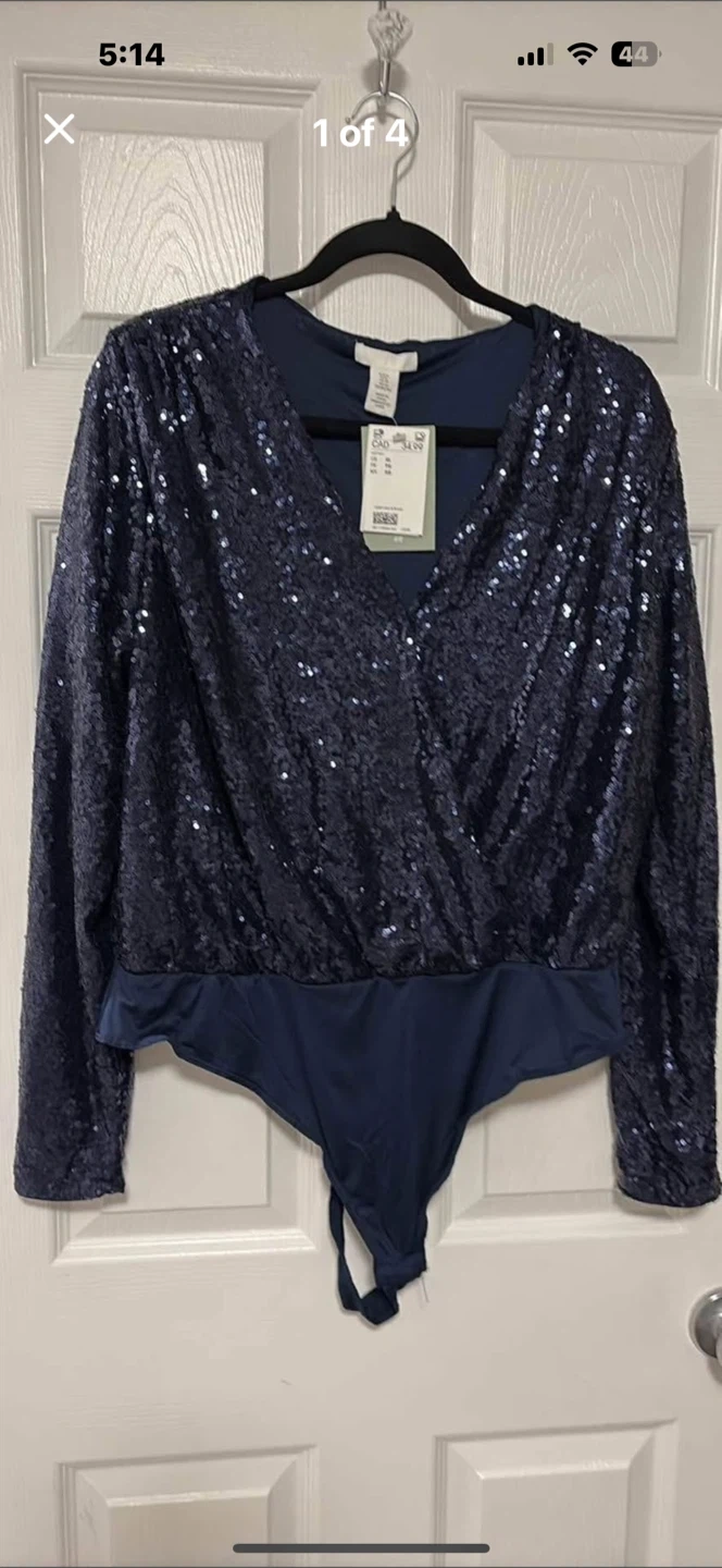 17Selling a sparkly H&M sequin bodysuit in size XL! It's a beautiful navy colour and features long sleeves and a flattering wrap style. Perfect for a night out or special occasion. Originally bought for $34.99!