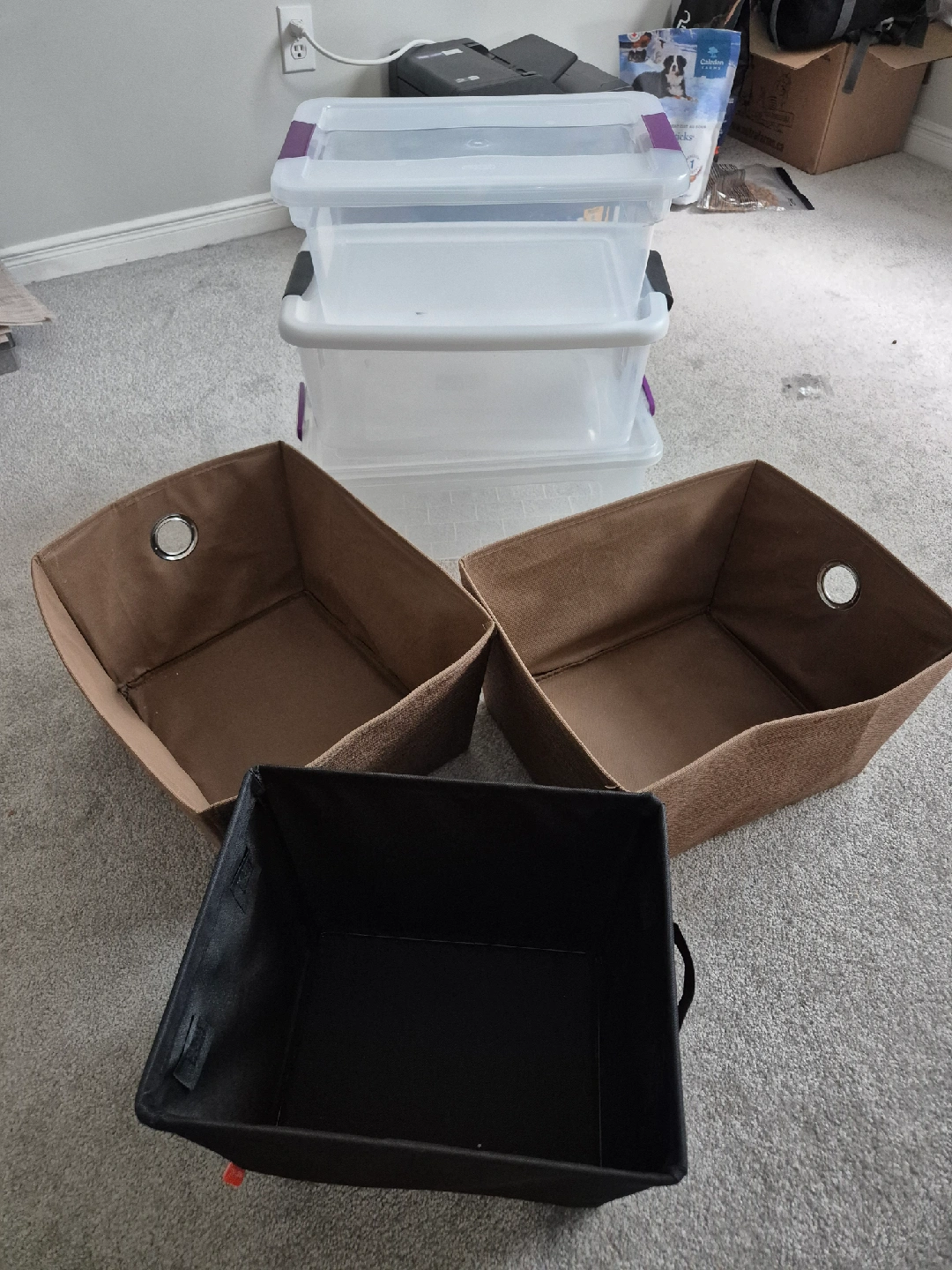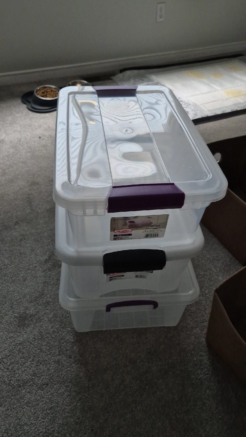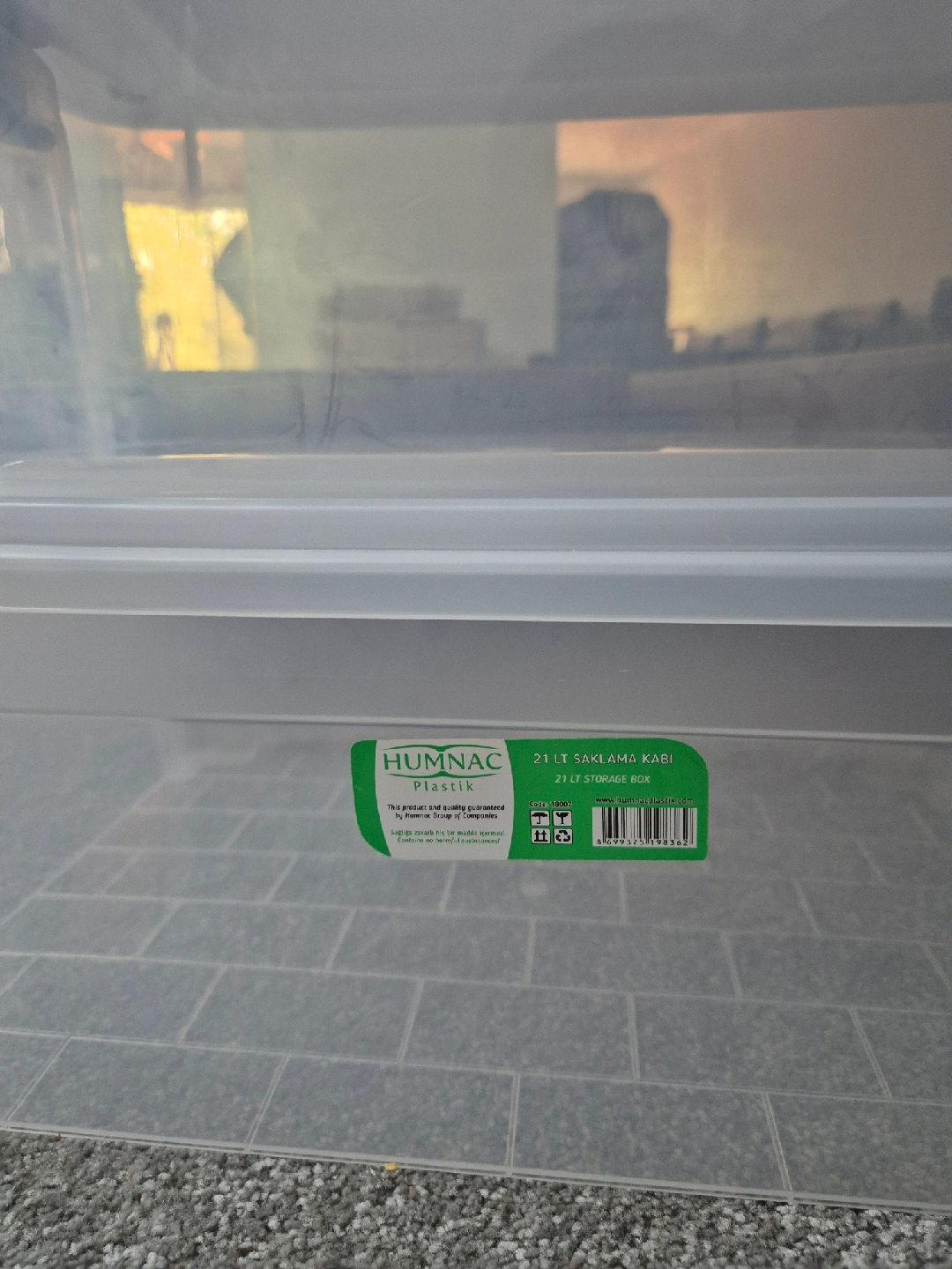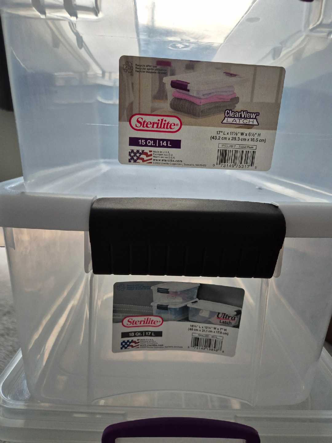 60Sterilite boxes, including one that's 15 qt (14 L) and measures 17" x 11 5/8" x 6 1/2" (43.2 cm x 29.3 cm x 16.5 cm). There's also a Humnac Plastik box that's 21 LT. all for 15 cad