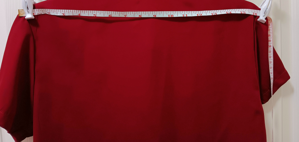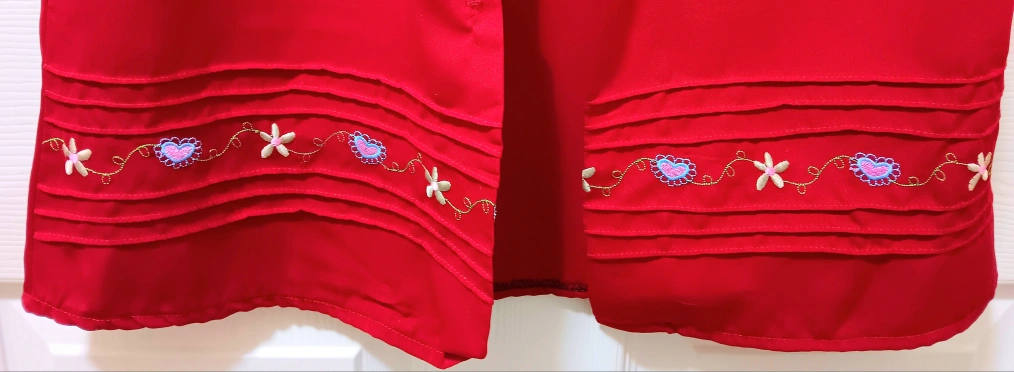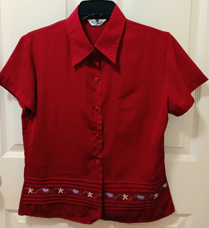 This is a red blouse with short sleeves and decorative embroidery near the bottom, perfect for adding a touch of flair to your wardrobe. The blouse is used once, but in excellent condition, ready for its next adventure!