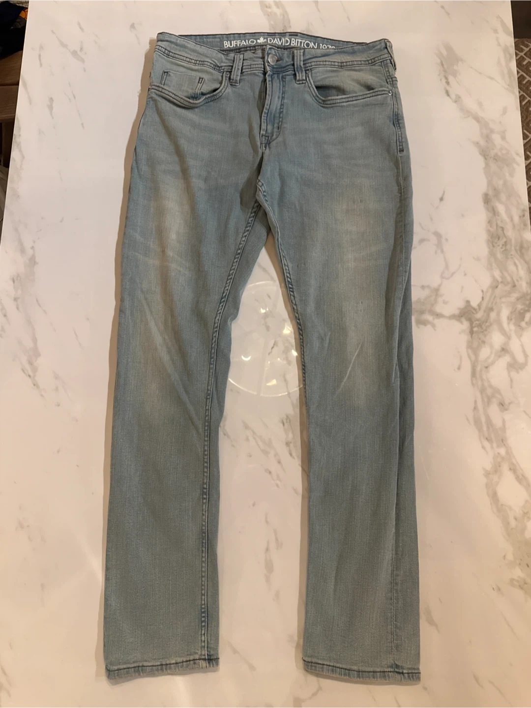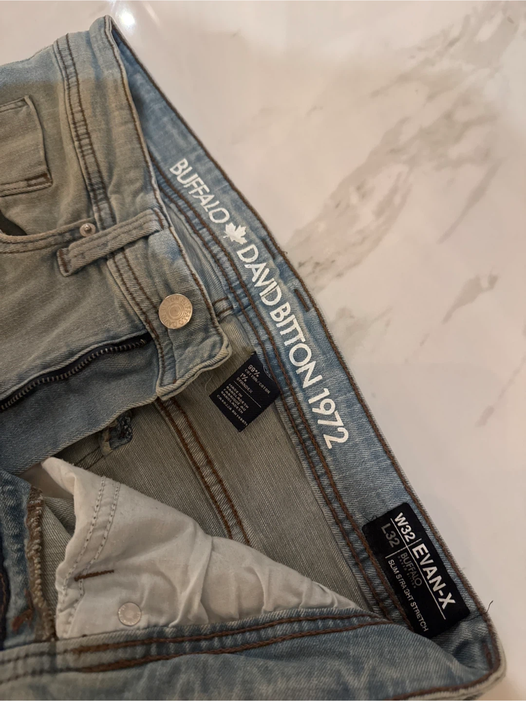 Selling a pair of Buffalo David Bitton Evan-X jeans in size 32. They are a light wash and in great condition. Perfect for everyday wear!