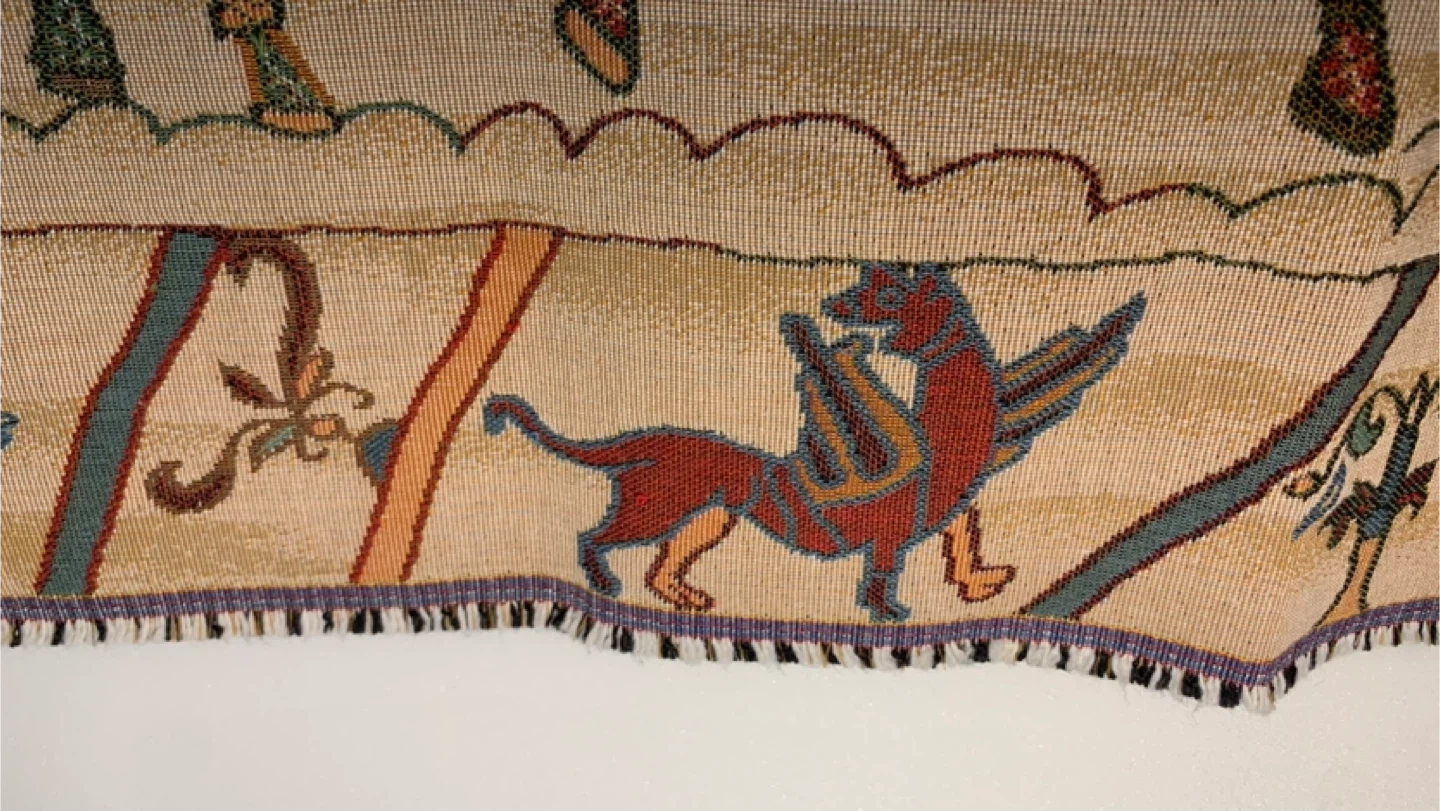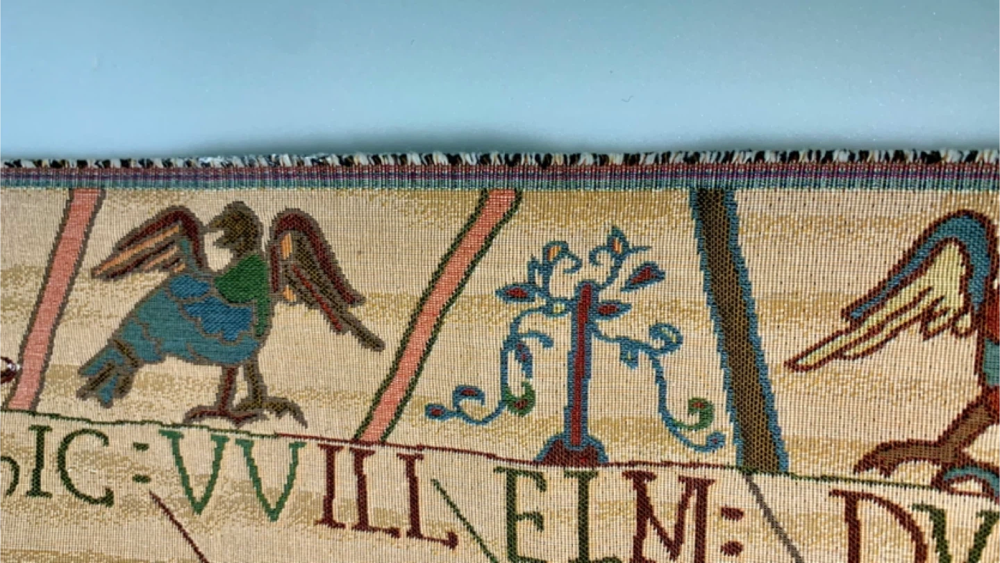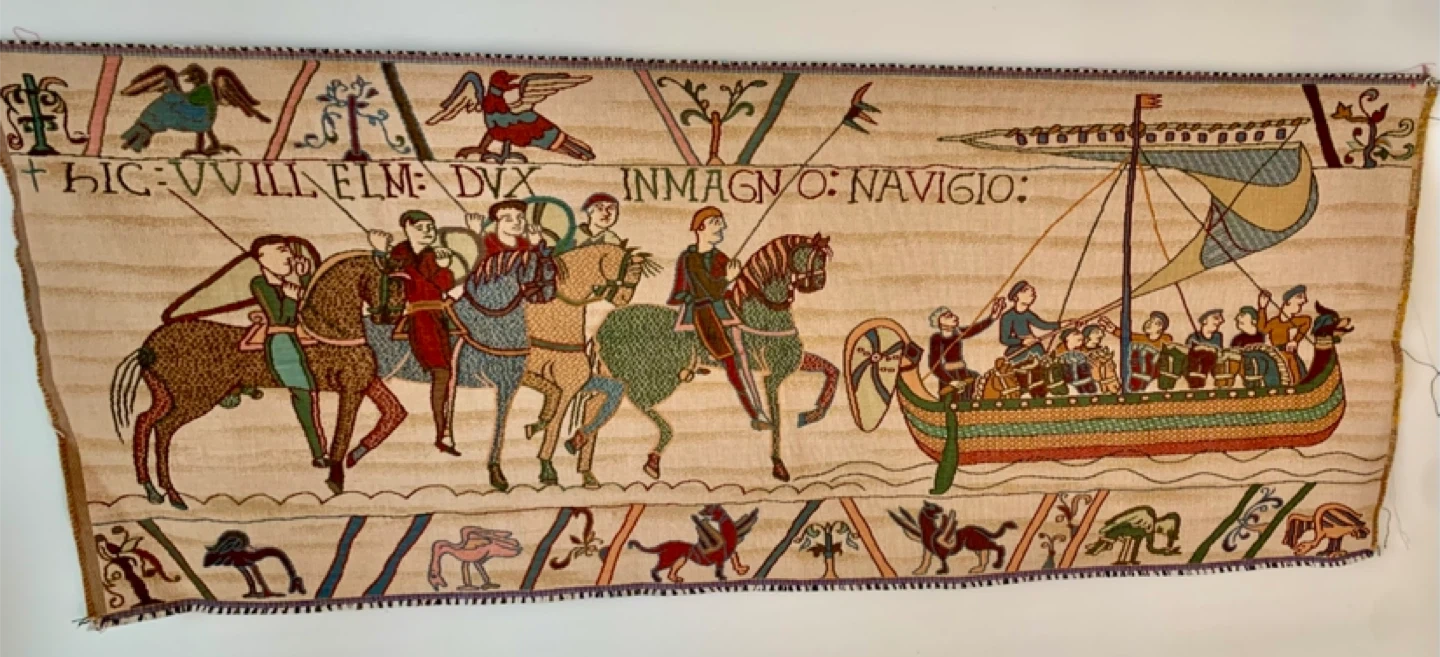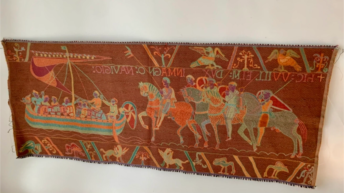1000+This famous embroidery shows William Duke of Normandy as he embarks for England in his armada. Woven in France. 20" x 49"