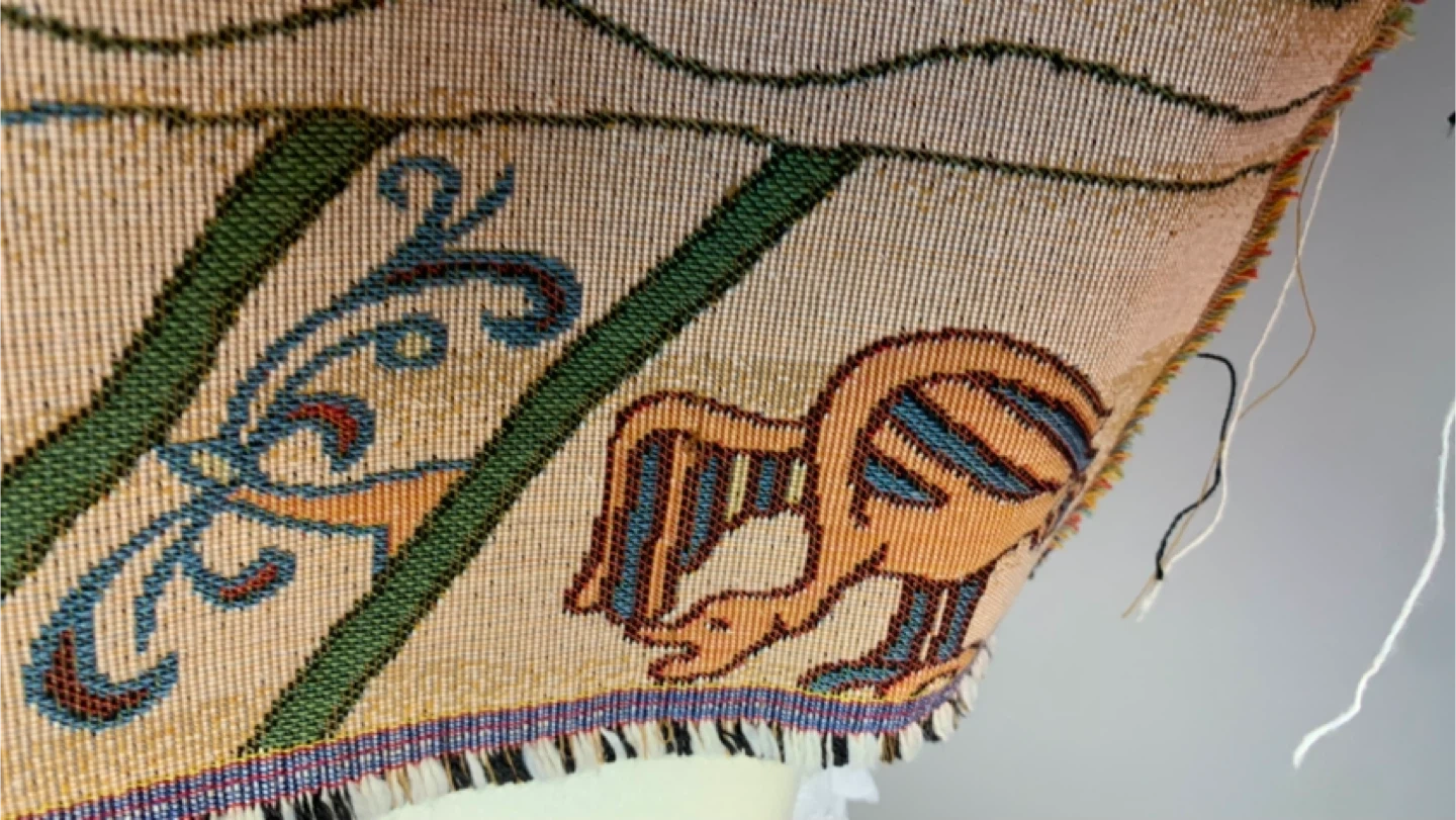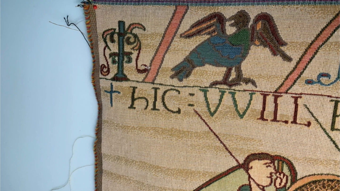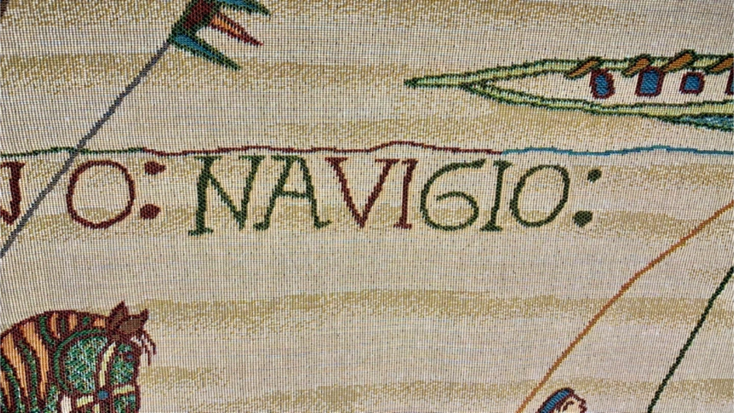 1000+This famous embroidery shows William Duke of Normandy as he embarks for England in his armada. Woven in France. 20" x 49"