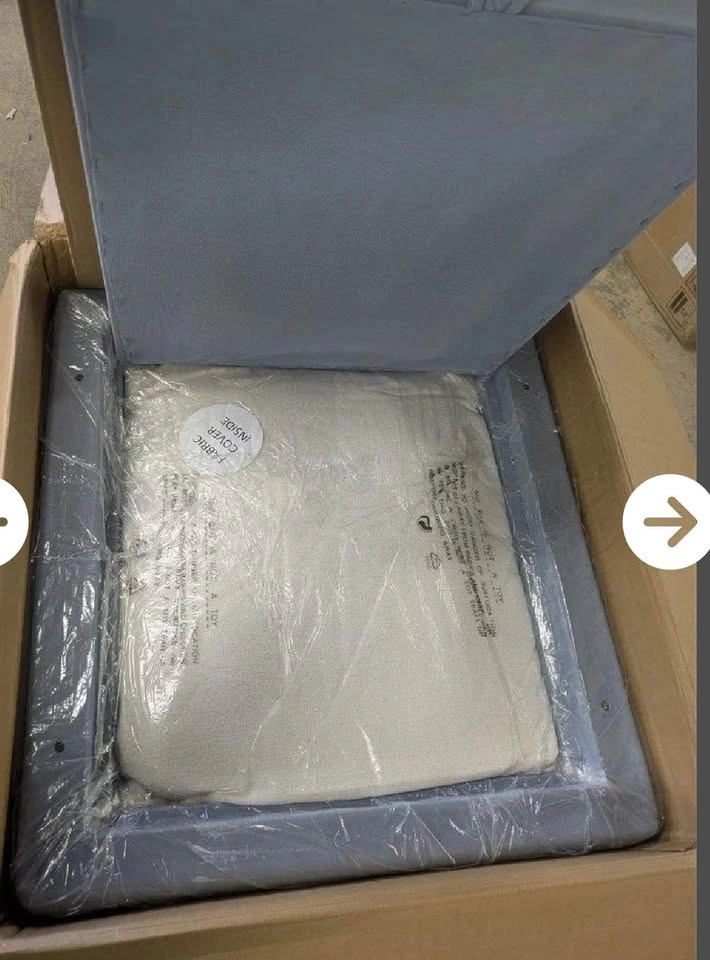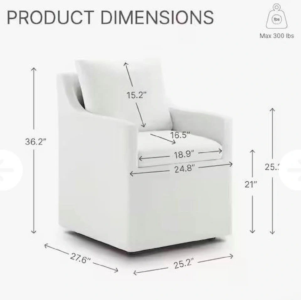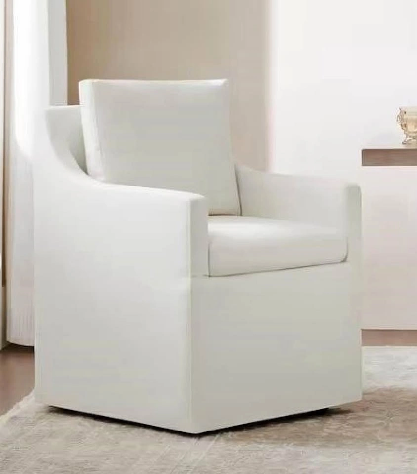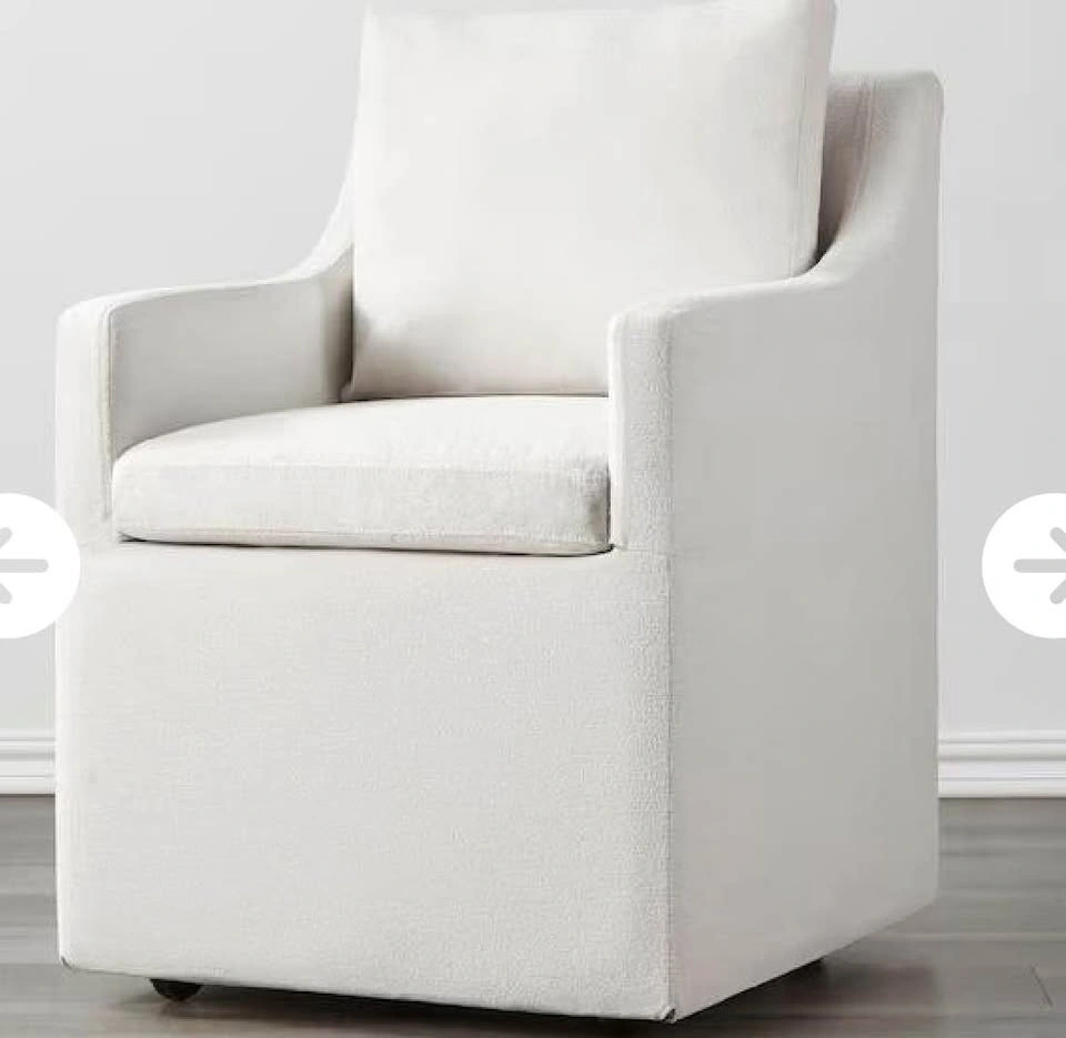 Brand new, never used ivory "Anywhere Chair." It's a stylish, multi-functional seat designed for modern living. Great as a dining chair, vanity chair, or home office chair. Features hidden casters (removable if you prefer a stationary setup) and a machine washable, removable slipcover. Dimensions: