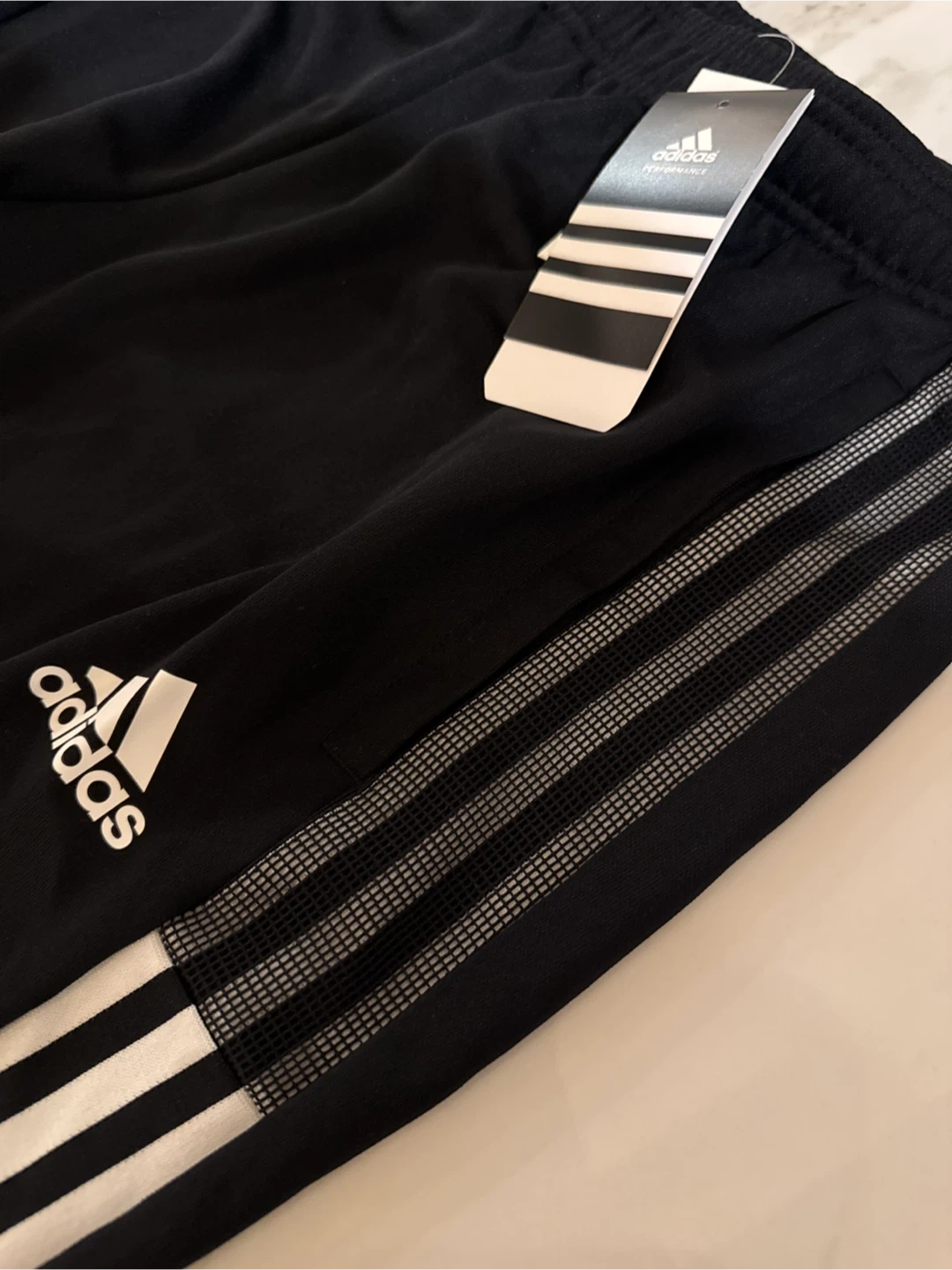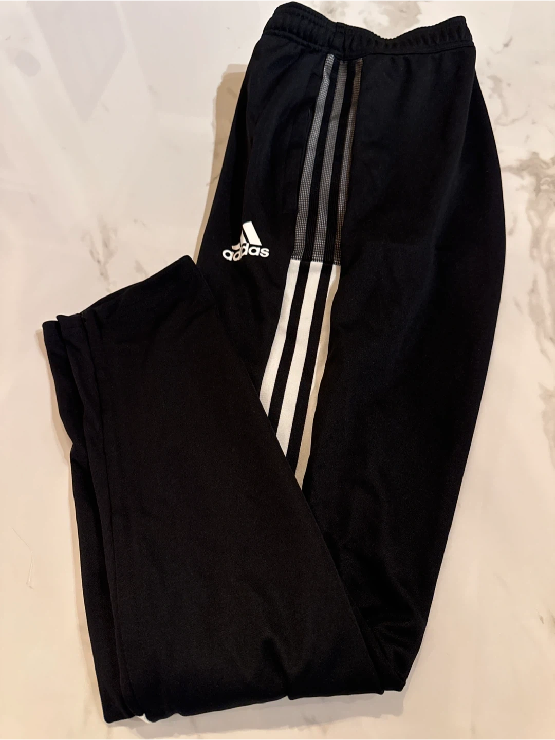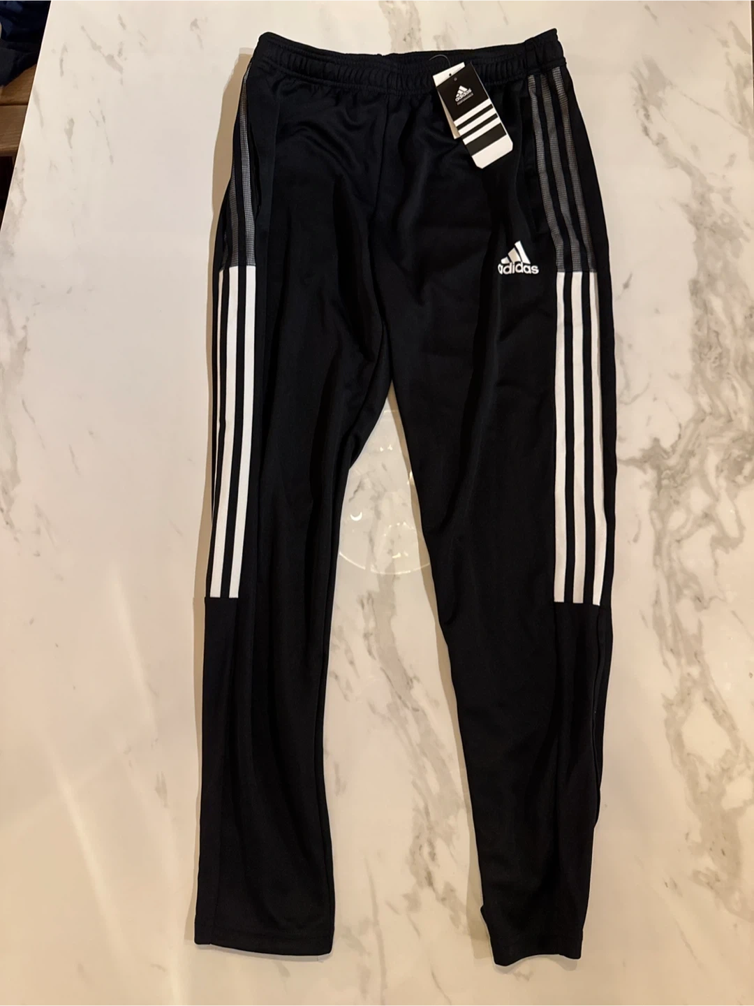 With tags. Adidas black track pants with the classic three stripes! These are a size medium but fit large and in new condition. Perfect for sports or just lounging around the house
