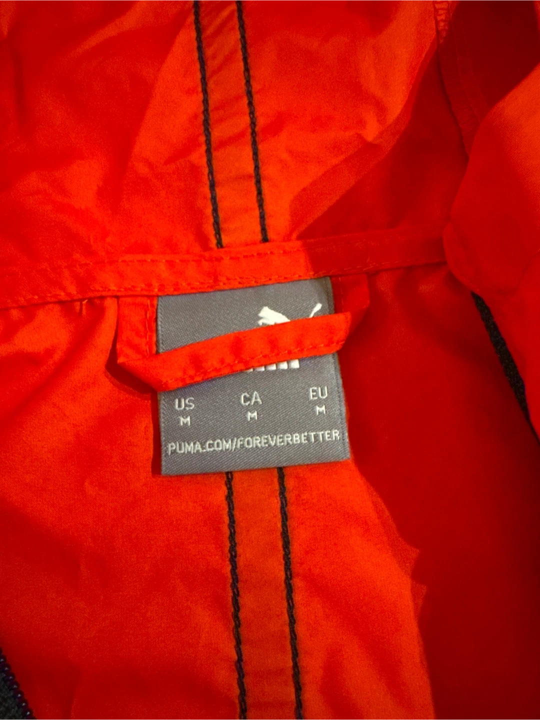 Selling a bright red Puma windbreaker jacket in size medium. It features the Puma logo and branded tape detailing along the sleeves. Perfect for layering or wearing on a windy day!