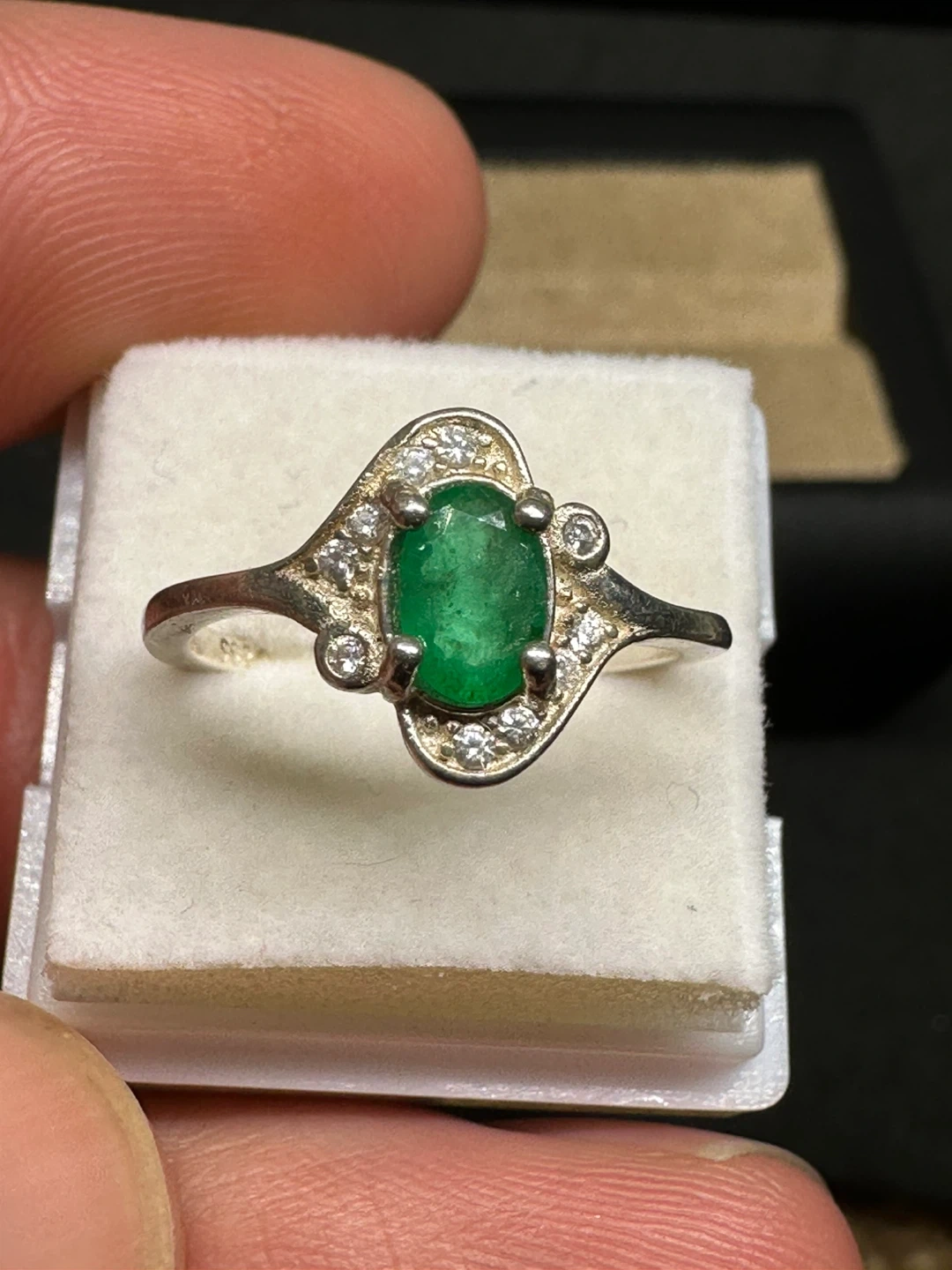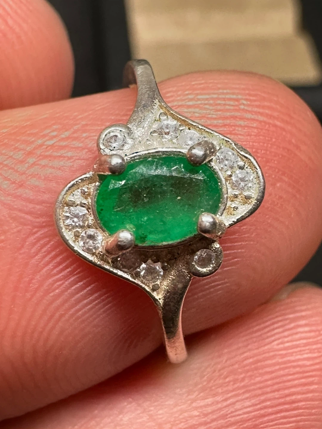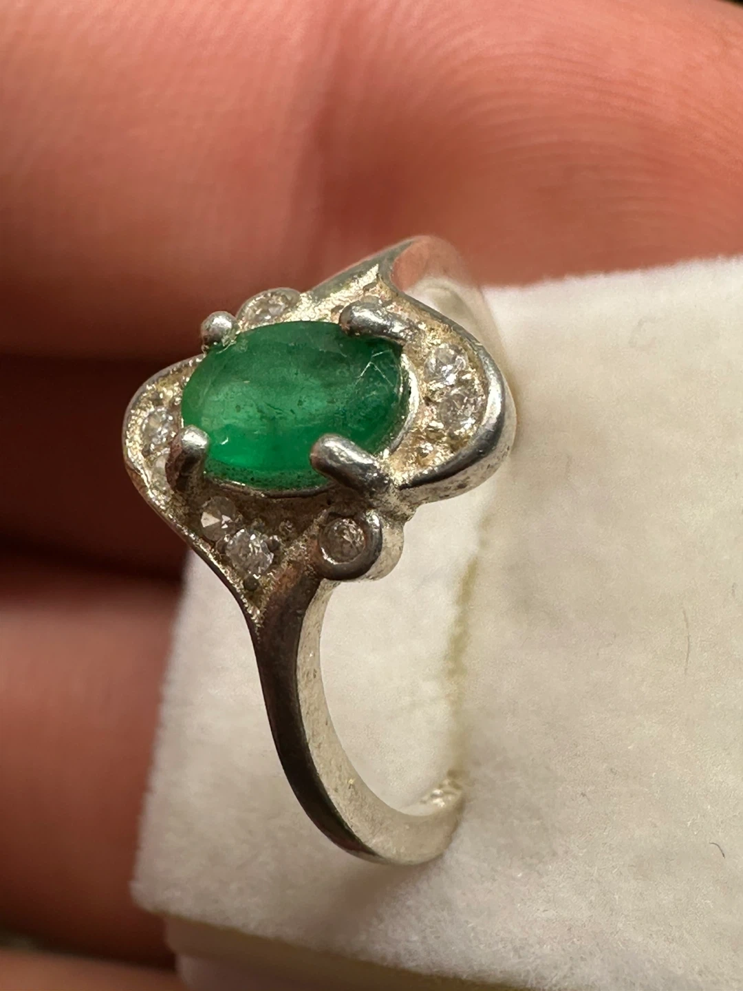62Selling a beautiful emerald ring surrounded by White Zirconia In sterling Silver . It's in great condition and ready for a new home! The ring has a silver band. The band is stamped with 'S925'.