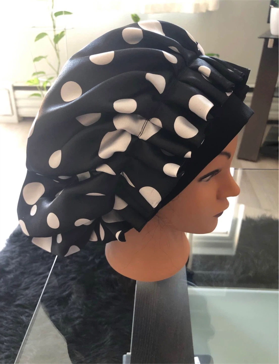 Selling a black satin bonnet with white polka dots! It's in great condition and perfect for protecting your hair while you sleep. The elastic band ensures a snug and comfortable fit