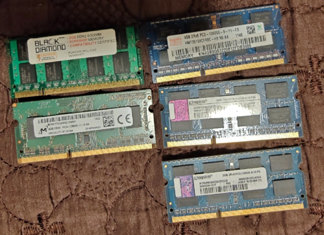 Selling a collection of RAM sticks from various brands including Black Diamond, Hynix, and Kingston - Black Diamond: 2GB DDR2 SODIMM - Hynix: 4GB 2Rx8 PC3-10600S - Kingston: 4GB and 2GB PC3-10600S Perfect for upgrading or repairing older Laptops.